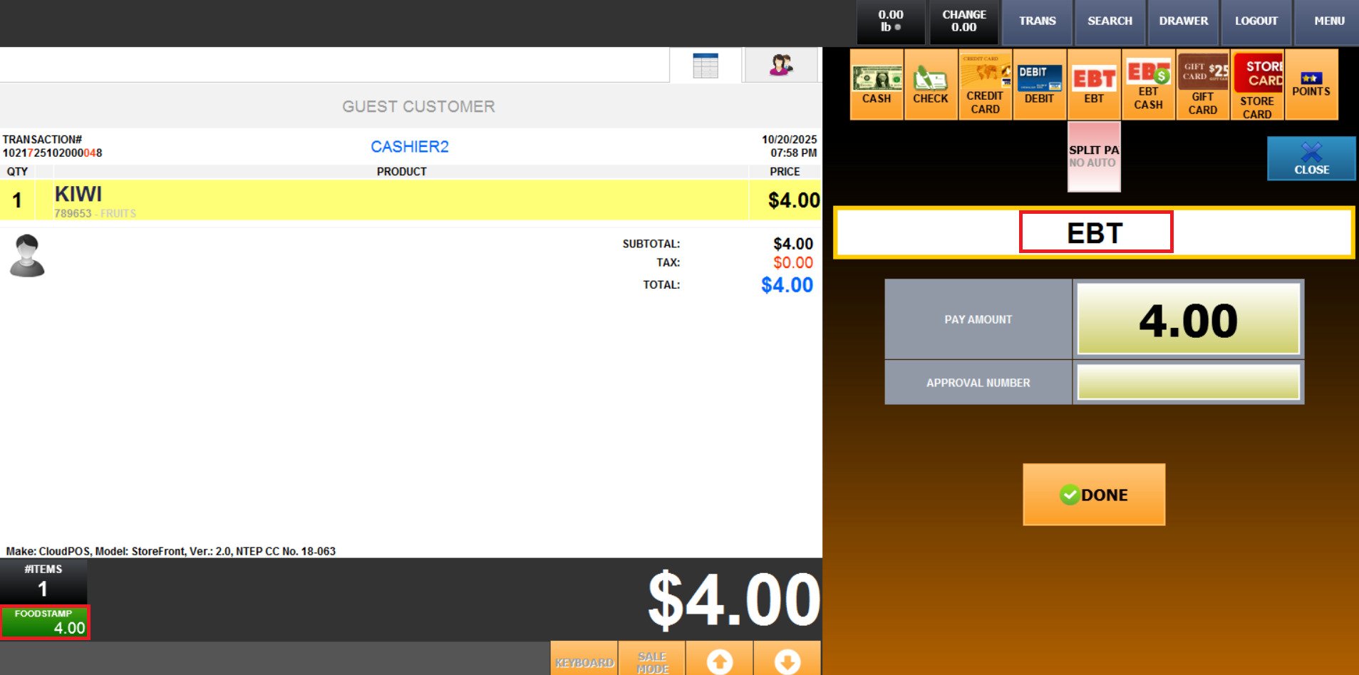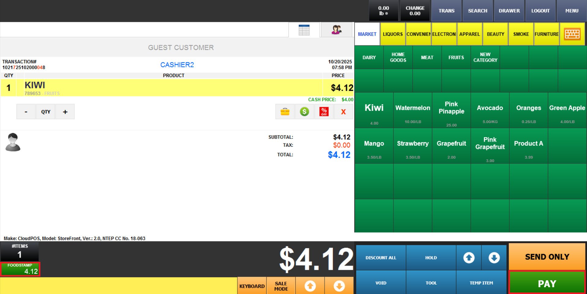 Once all items have been rung up, the foodstamplable items total will be displayed below on the green FOODSTAMP button, then press on PAY.