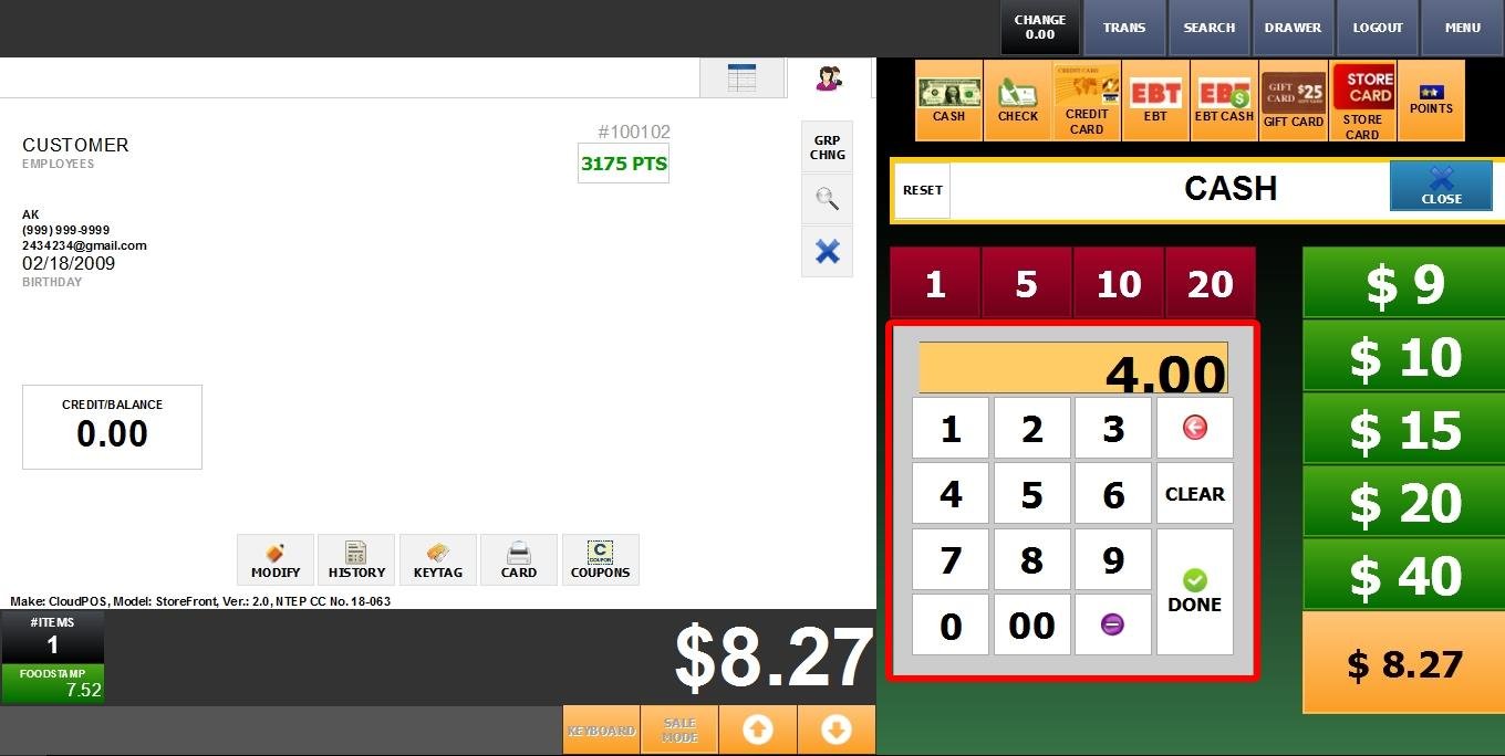 Select the desired payment method; in this example, Cash was chosen as the first option.