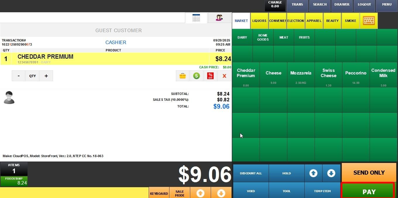 Ring up the items and press the PAY button.