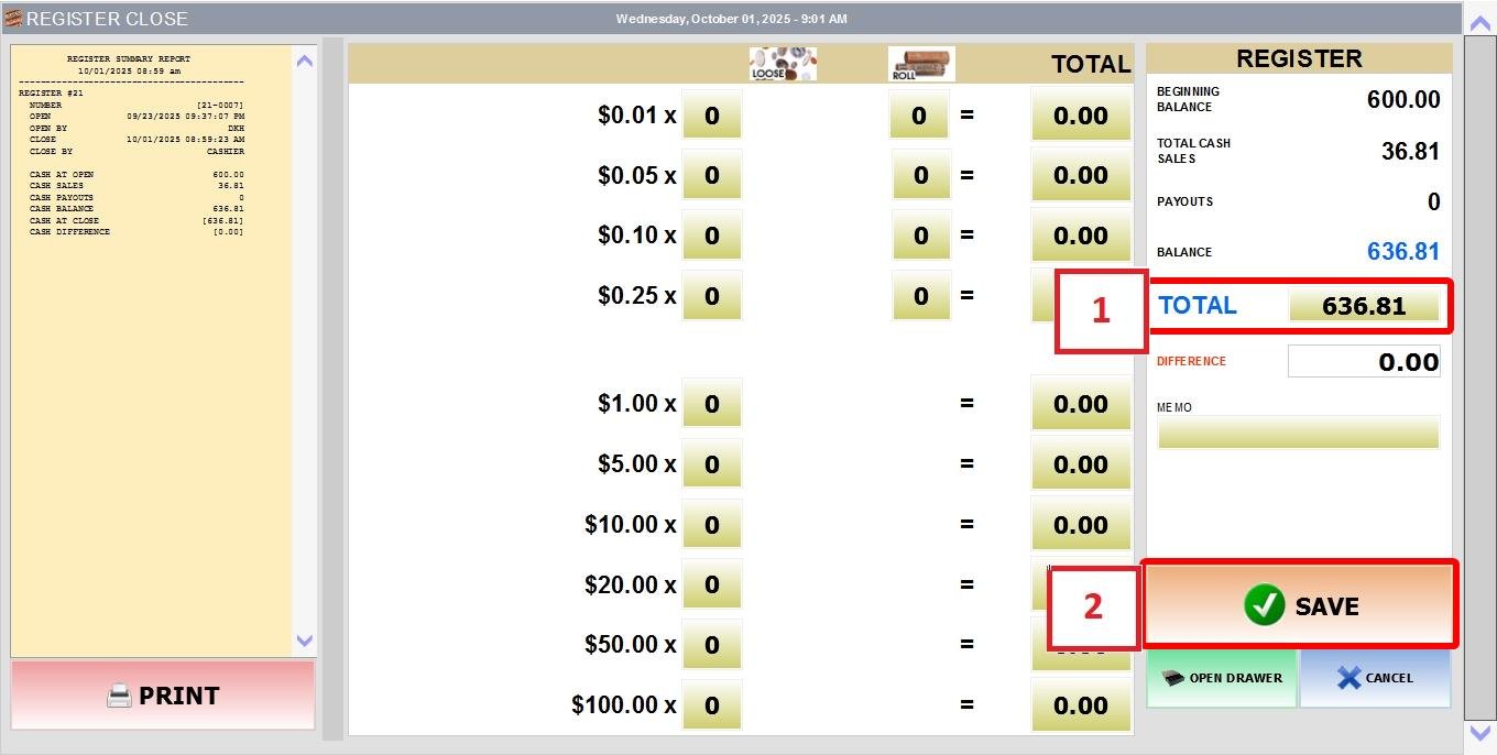 After confirming the TOTAL matches, proceed with the close by pressing SAVE.