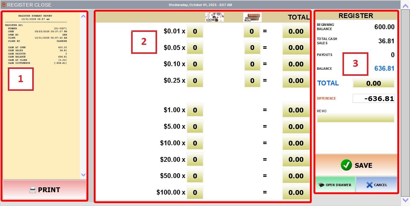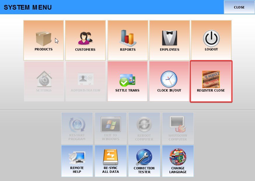 Main Screen> Number Pad> Sales Screen> MENU> REGISTER CLOSE