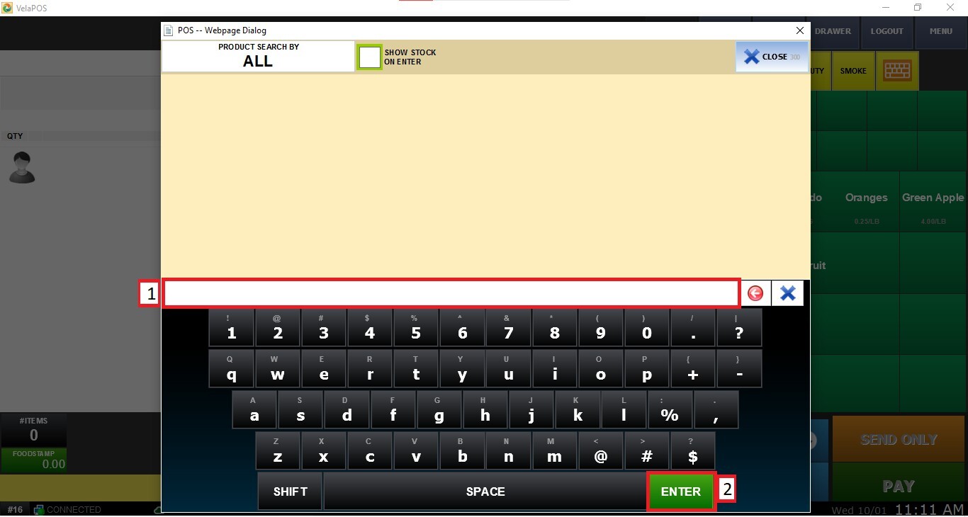 To filter the STOCK column check the SHOW STOCK ON ENTER box. The inventory count will be displayed as shown below.