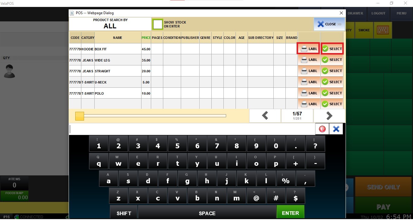 Click on LABEL to print the product label or SELECT to ring up the item.
