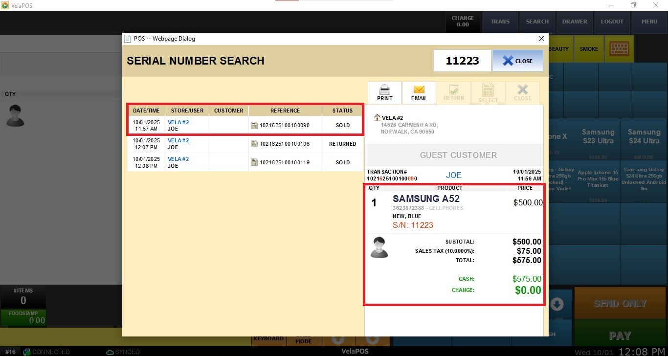 This tool allows you to search by the serial number of a previously sold item to quickly find the associated transaction and its detailed information.