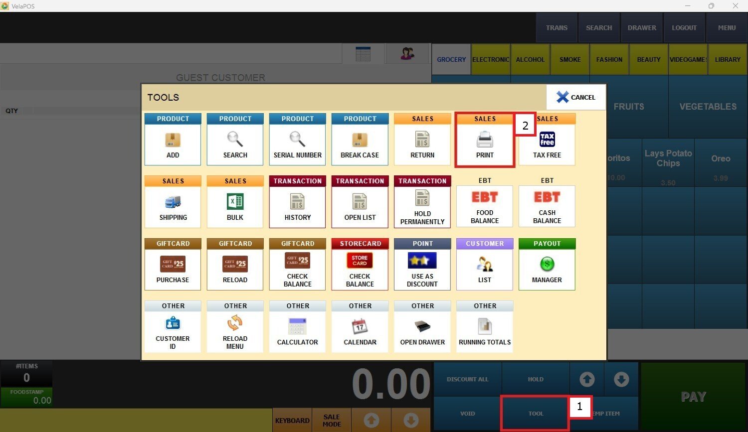 Main Screen> Number Pad> Sales screen> TOOL> PRINT