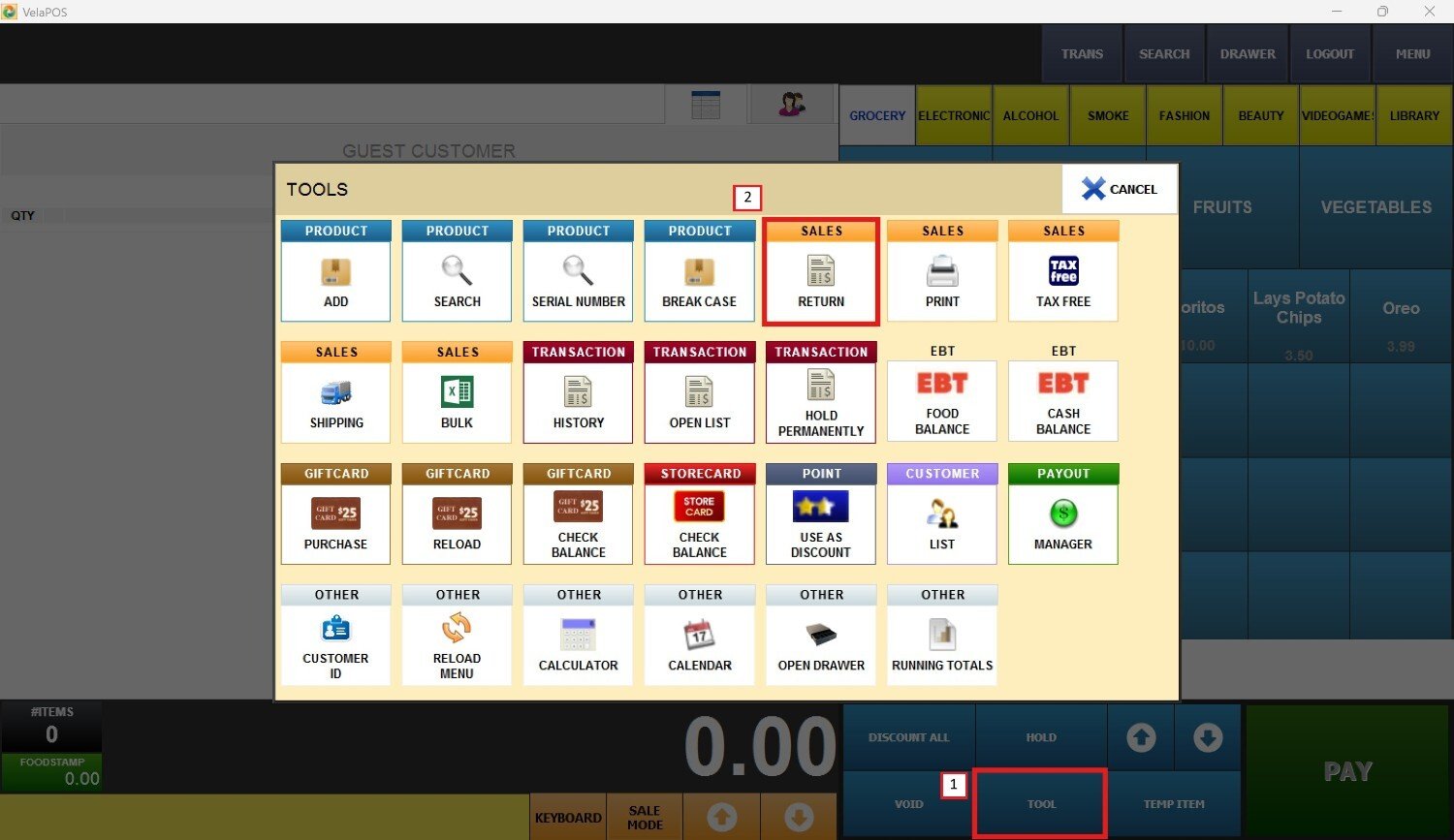 Main Screen> Number Pad> Sales screen> TOOL> RETURN