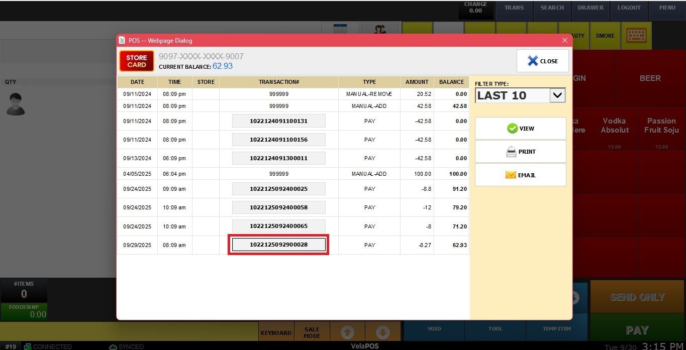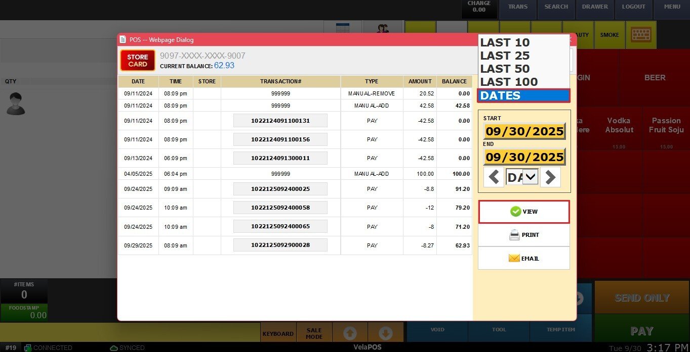A detailed report of all transactions made with the storecard will pop up, including the current balance at the top of the screen.
