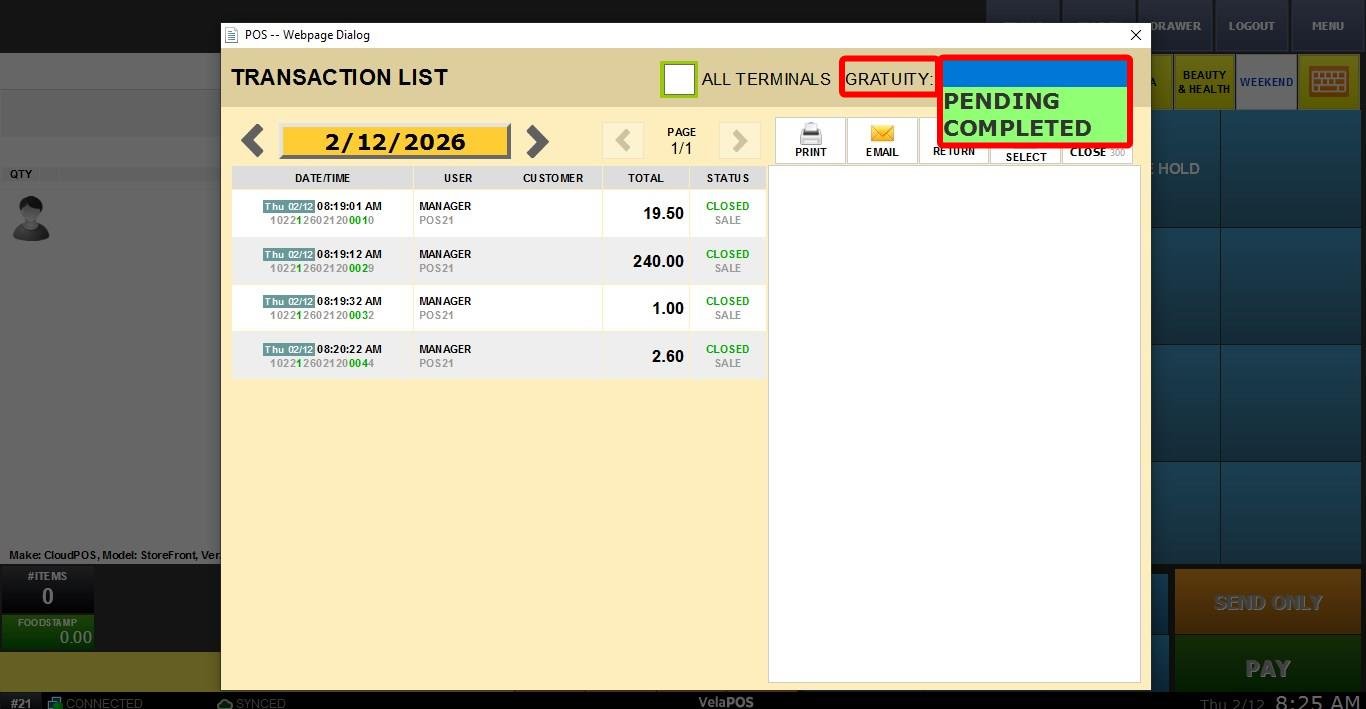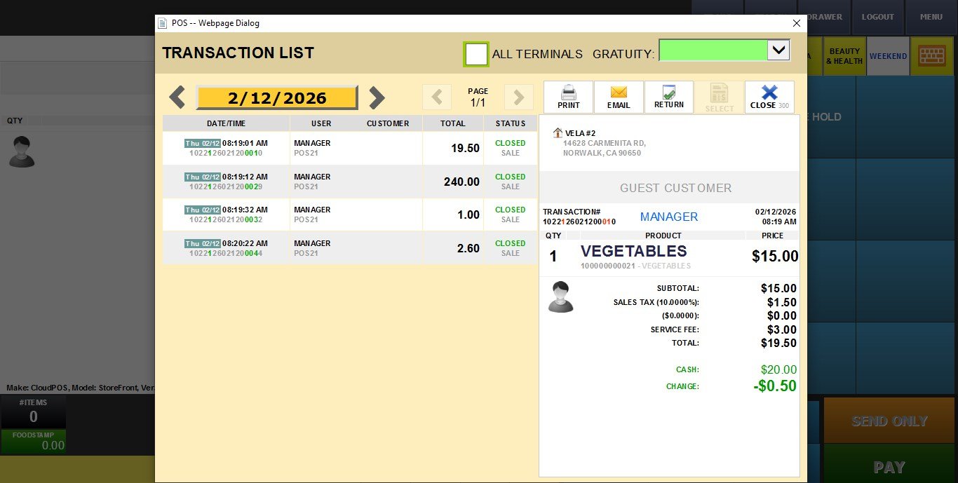 In the TRANSACTION LIST, all tickets from this POS are displayed on the left.