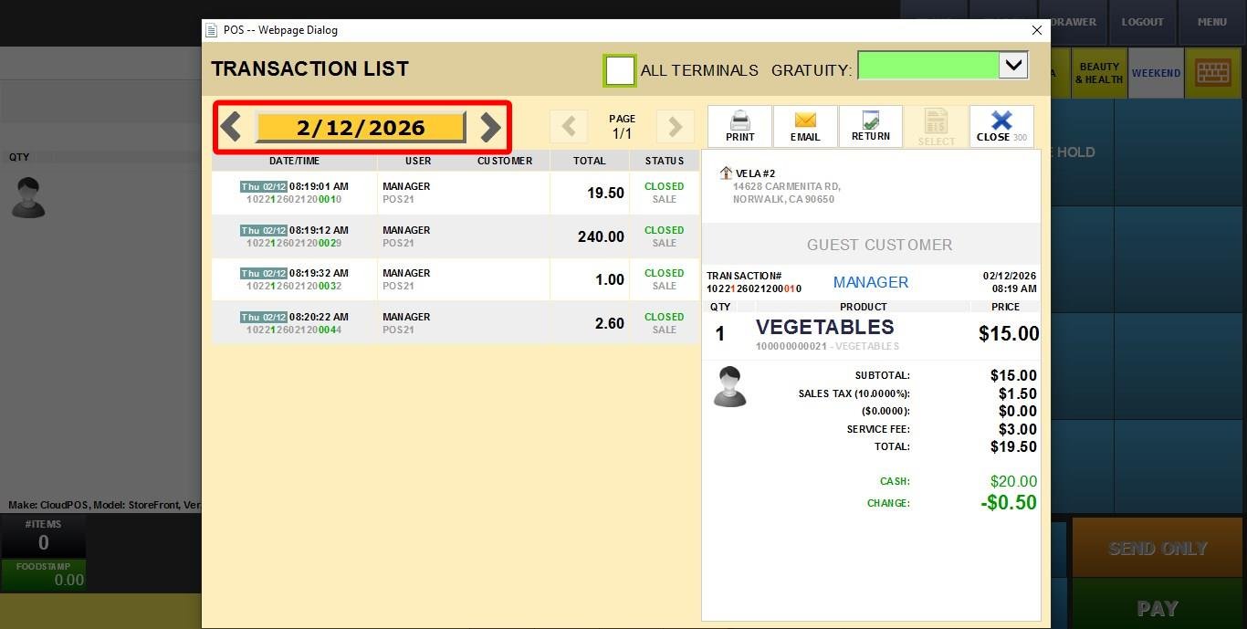 You can navigate through previous dates' transactions with the DATE BUTTON.