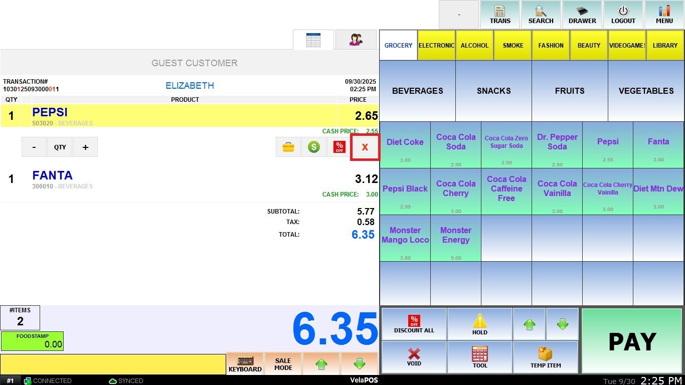 Click the X icon to void a specific product.