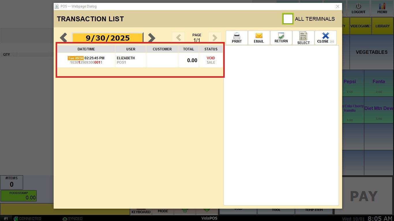 Voided transactions will be recorded in the transaction list and displayed as follows: