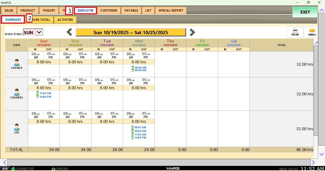 On REPORTS, go to EMPLOYEE and then SUMMARY.