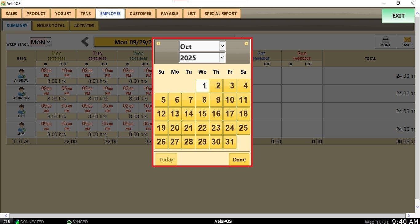 To view the report for a different week, press the < > arrows or select the Calendar button.