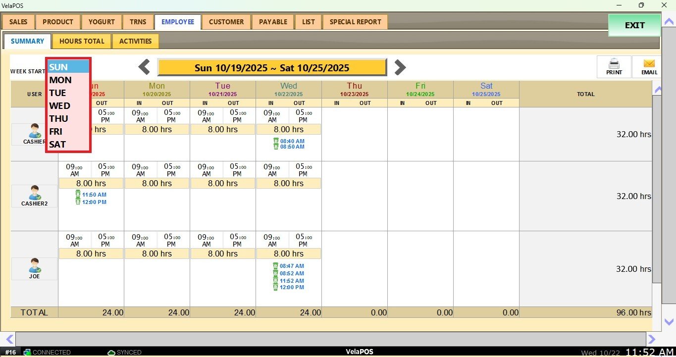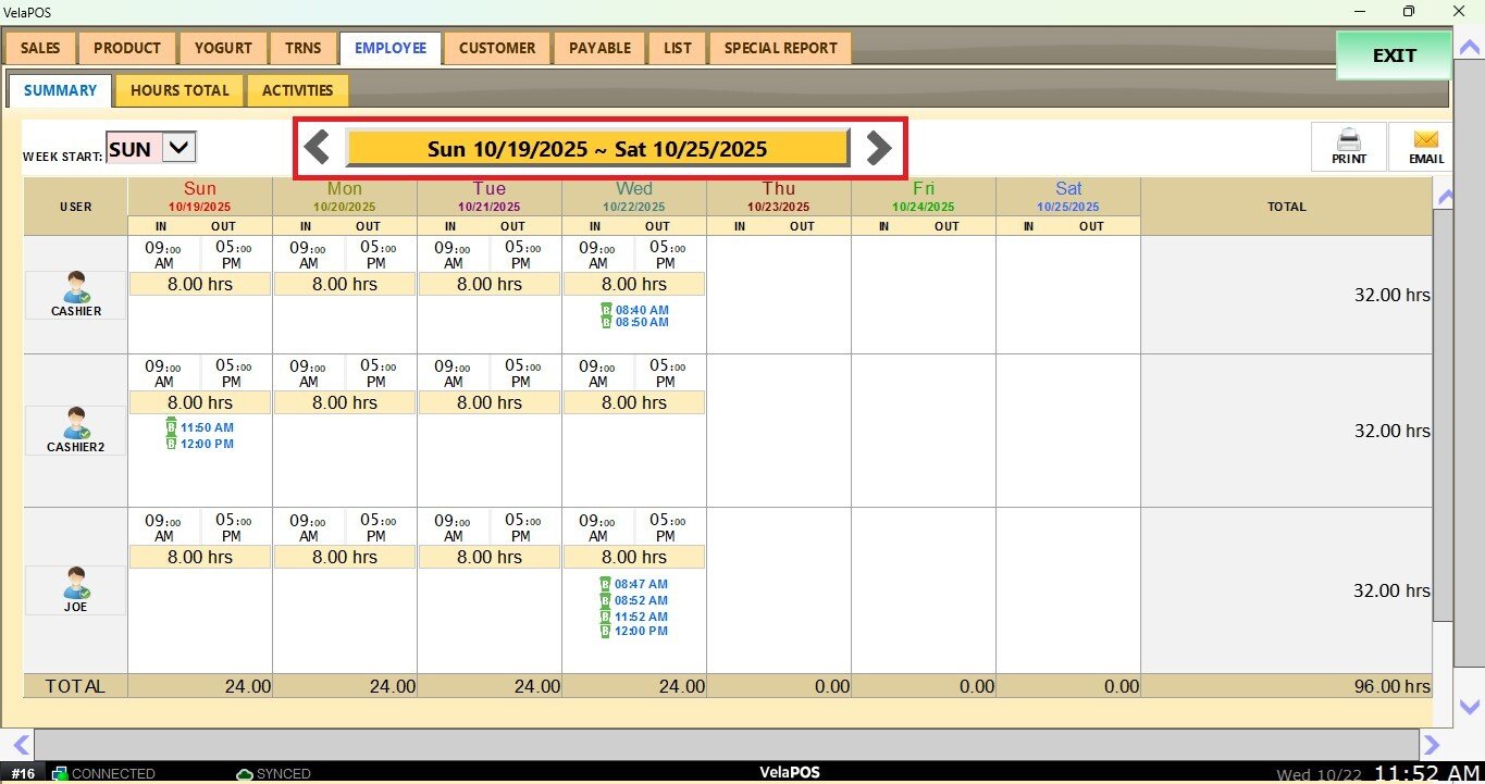 This report shows the employees’ clock-in, clock-out and break times in a weekly schedule view, as well as the total hours worked.