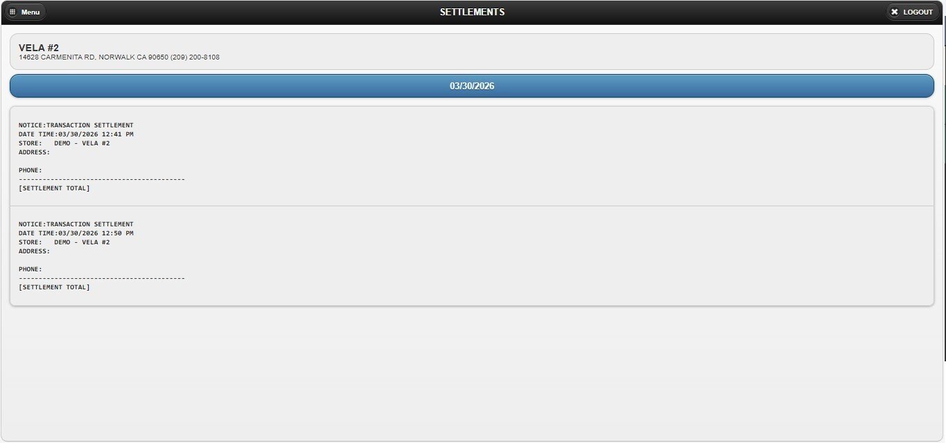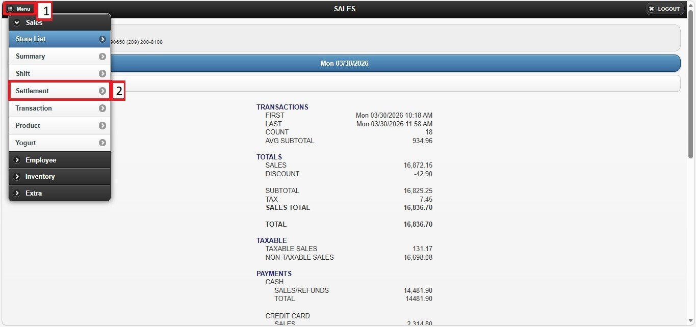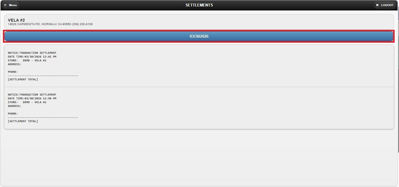 Login Screen> Select Store> MENU> SETTLEMENT