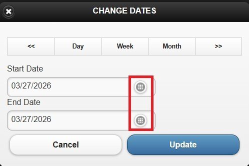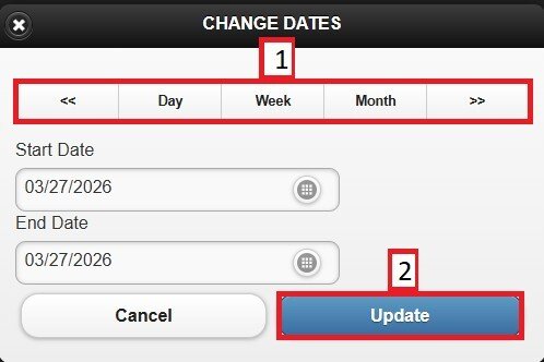 On the pop-up window, select DAY, WEEK, or MONTH. Use the side arrows to navigate forward or backward through the selected period.