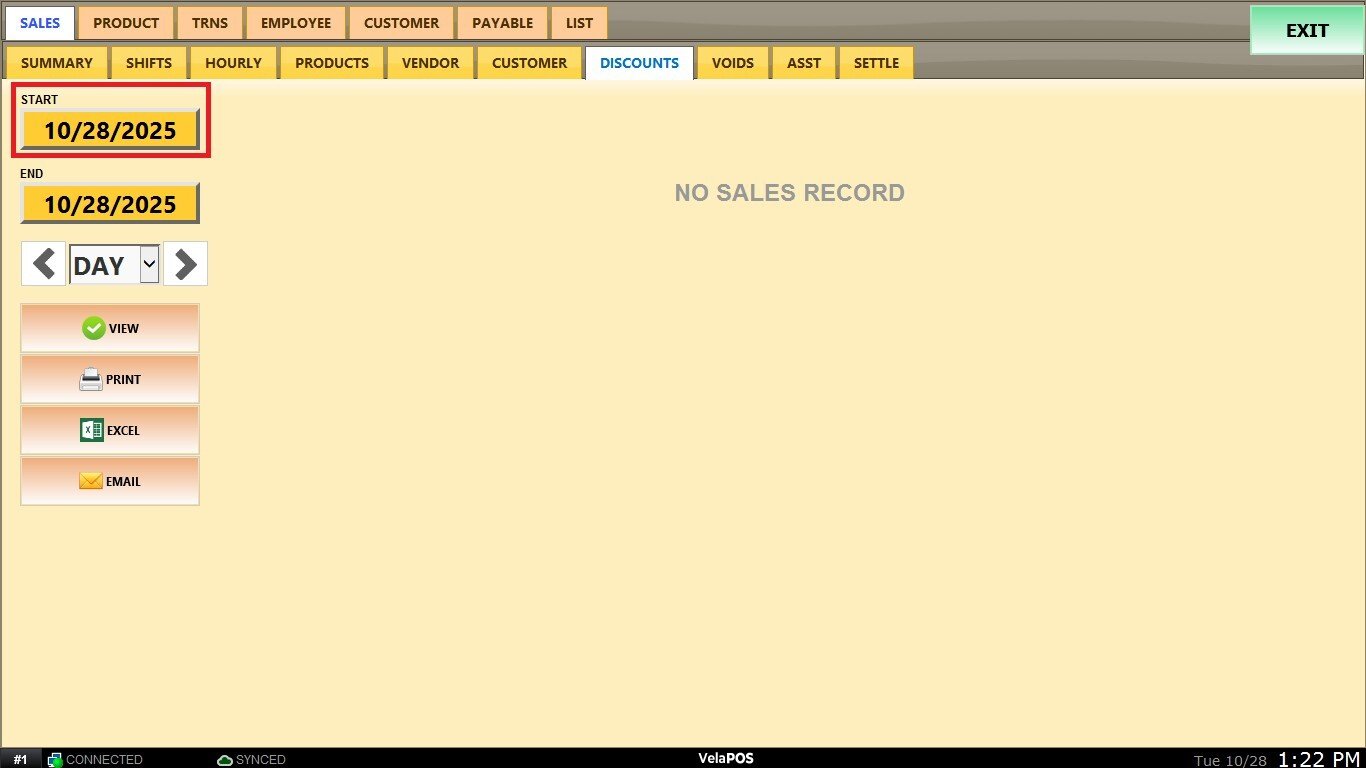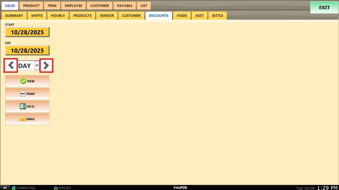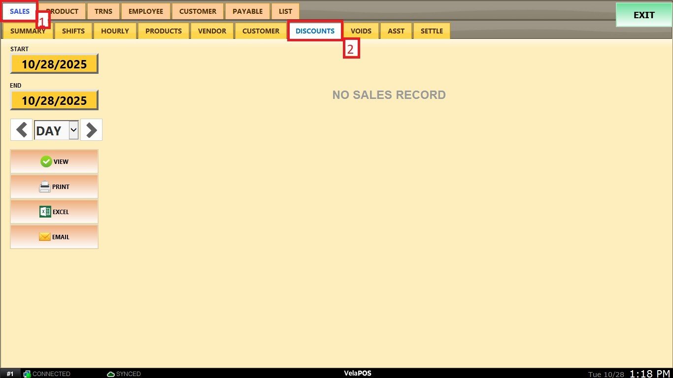 Main Screen> MENU> REPORTS> PRODUCT>SALES>DISCOUNTS