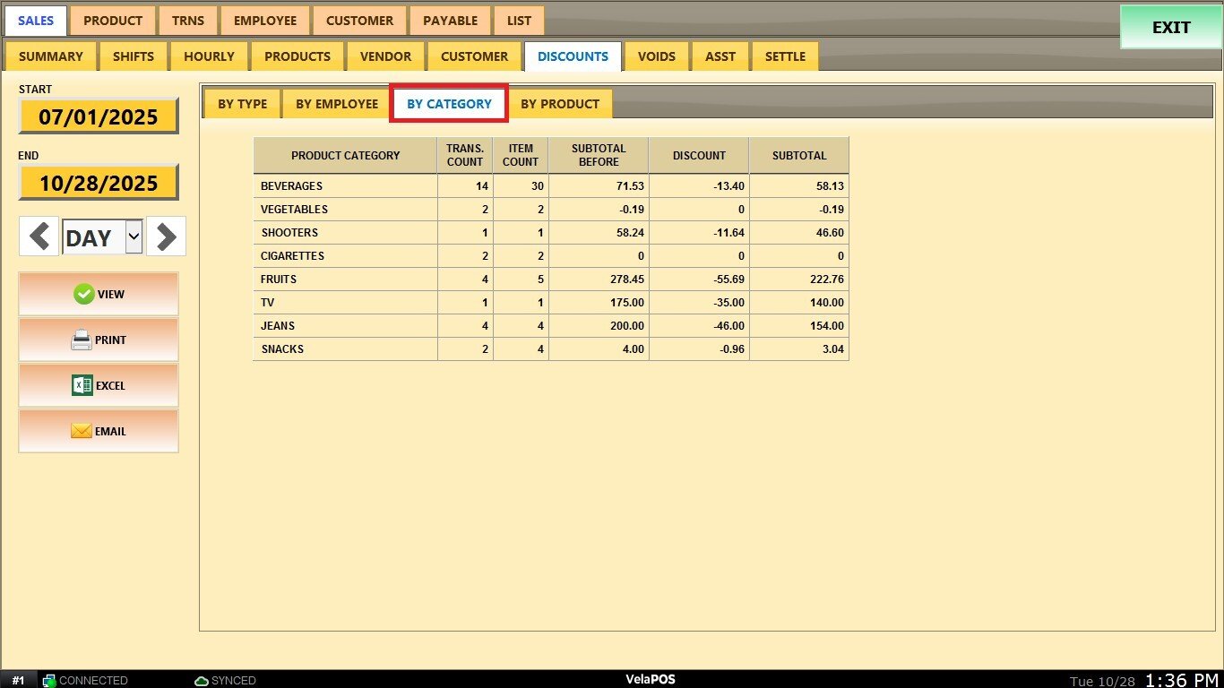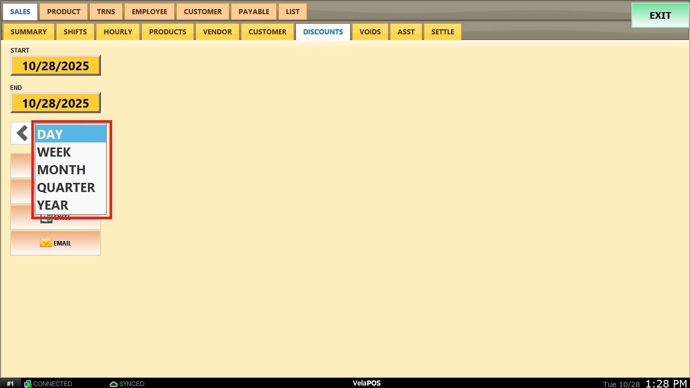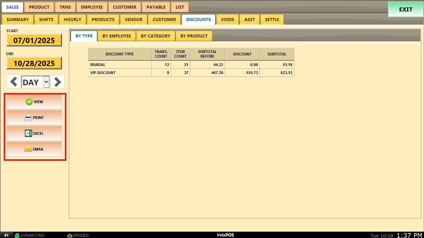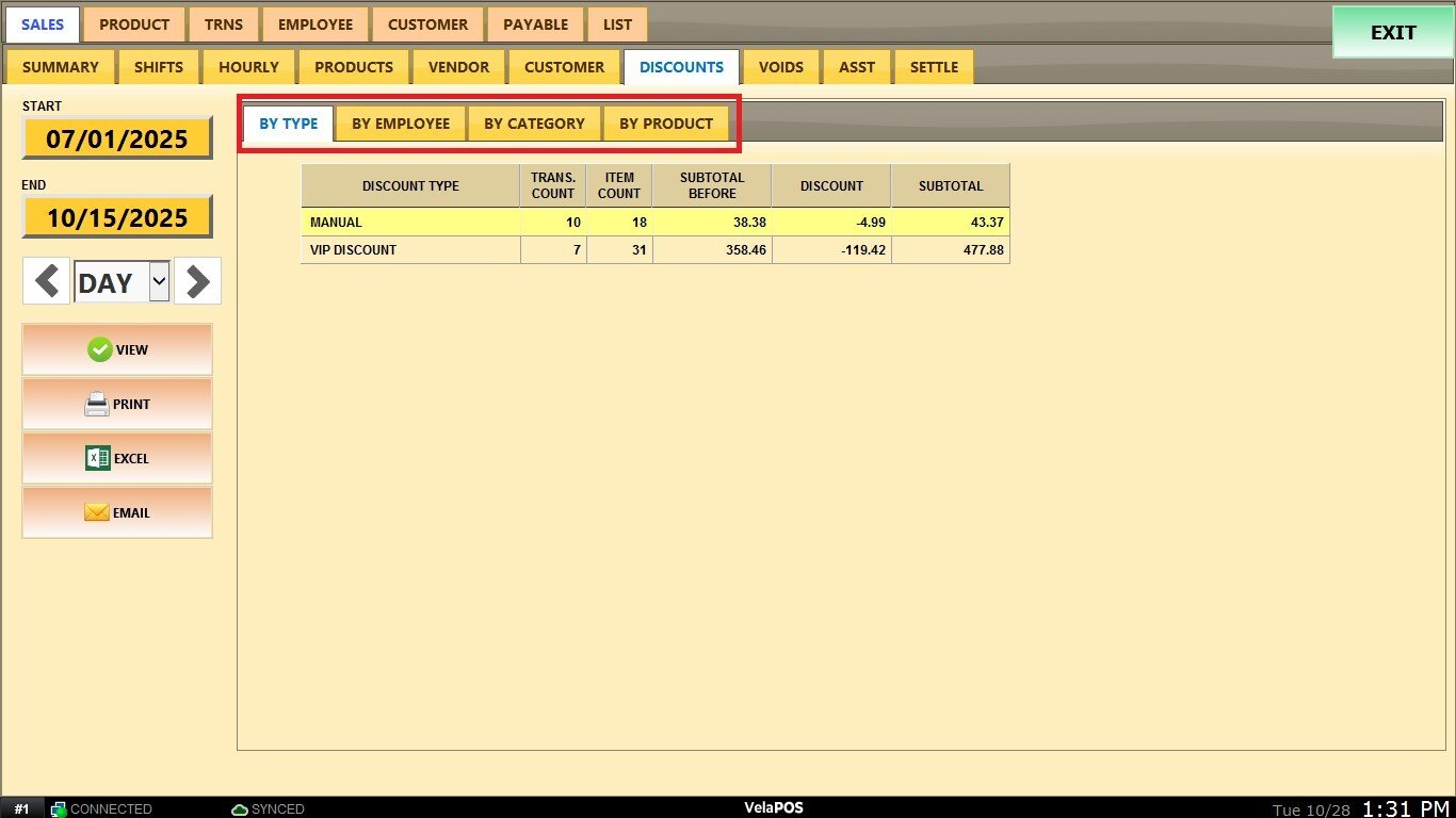 Main Screen> MENU> REPORTS> PRODUCT>SALES>DISCOUNTS