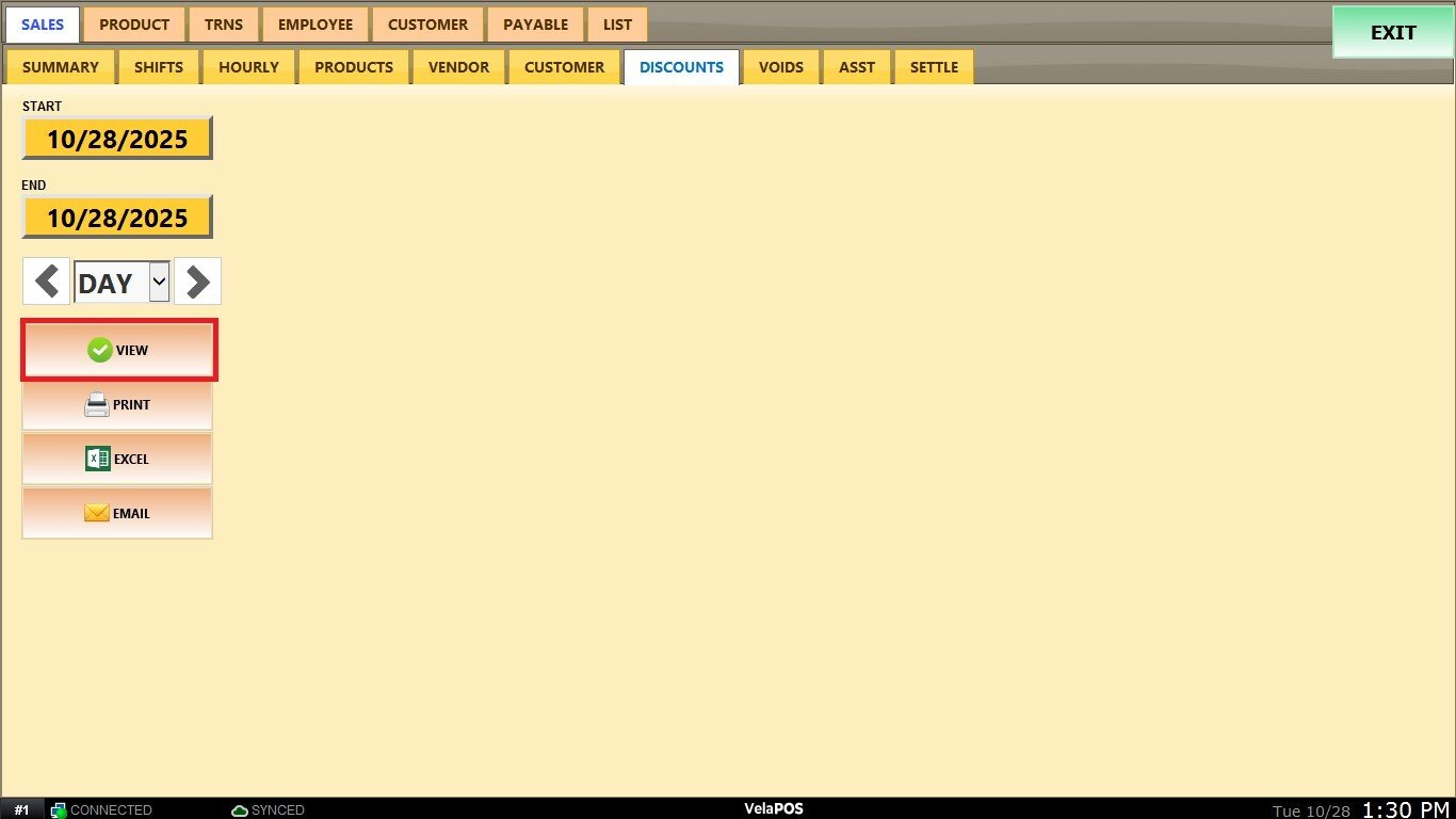 After setting the date range and time frame, press VIEW to display the report based on your selections.