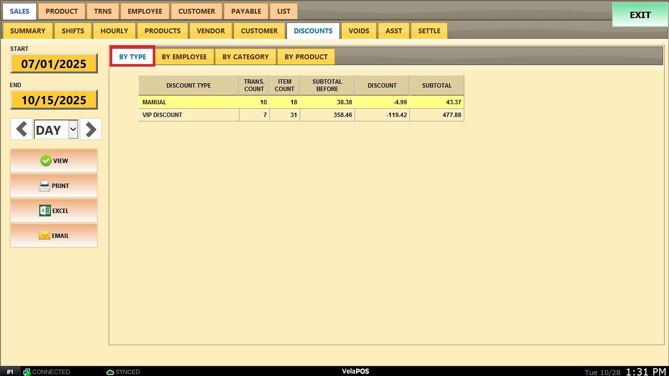Shows discounts grouped by discount type (e.g., VIP, Manual, etc.).