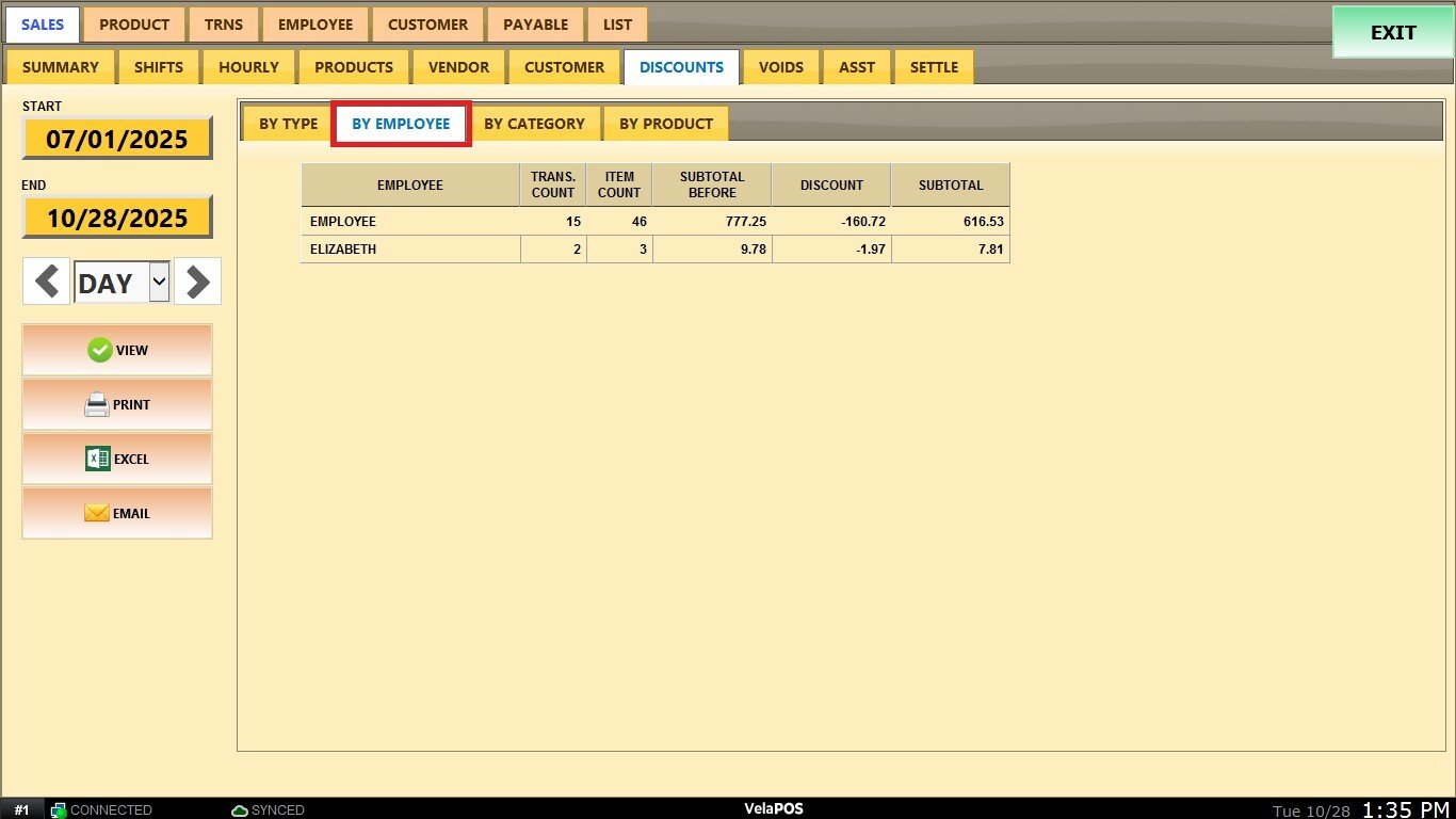 Shows discounts applied by each employee, helping track usage and monitor performance.