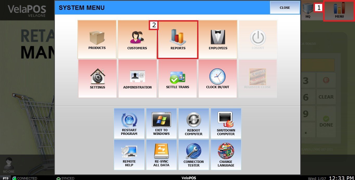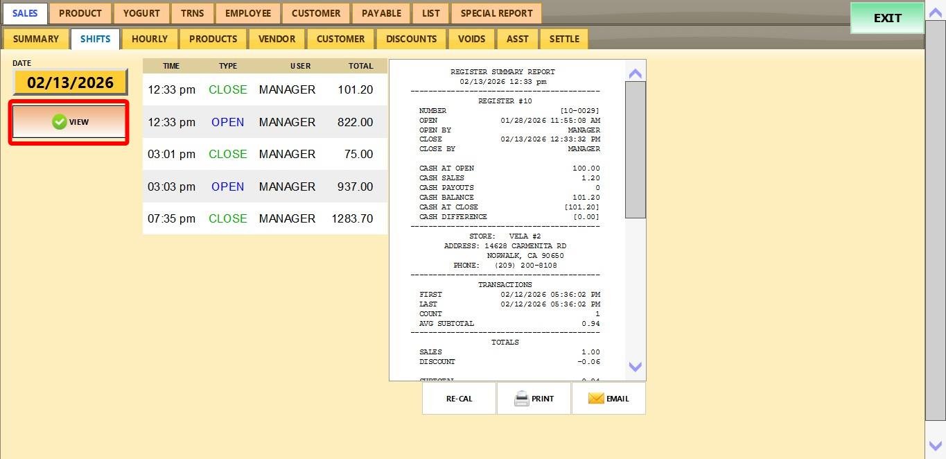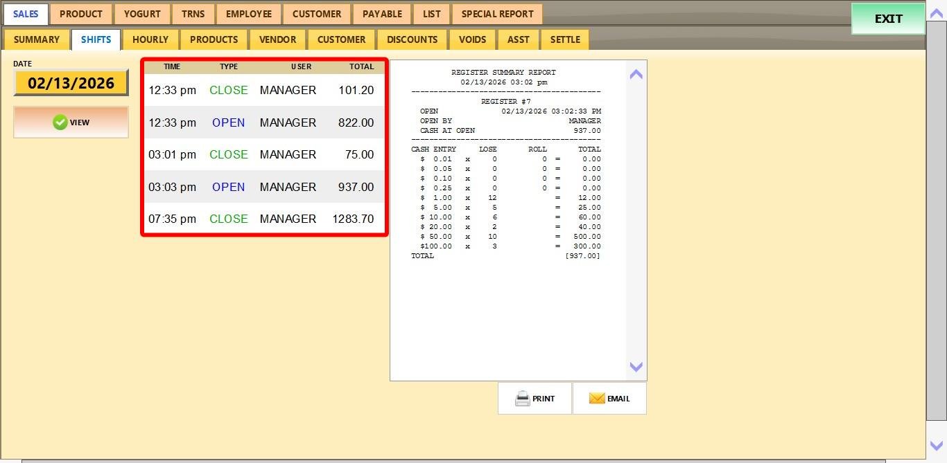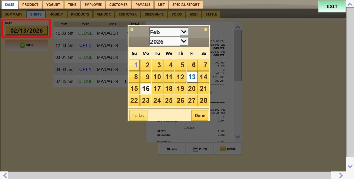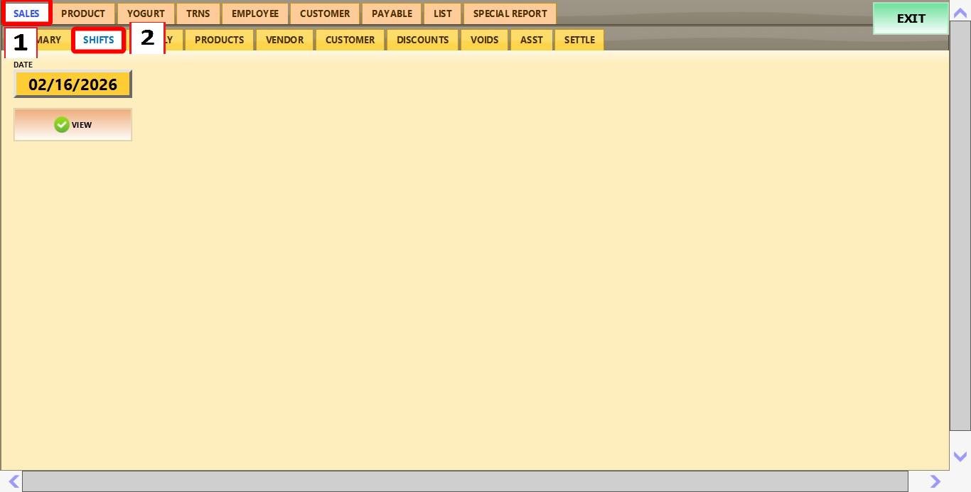 Main Screen> MENU> REPORTS> SALES> SHIFT