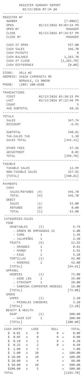 This report provides a chronological record of all register openings and closings performed on a selected date. It gives managers a quick way to verify who handled each register, when it was accessed, and the declared totals at each action. Essentially, it acts as a consolidated record of all register summary reports.