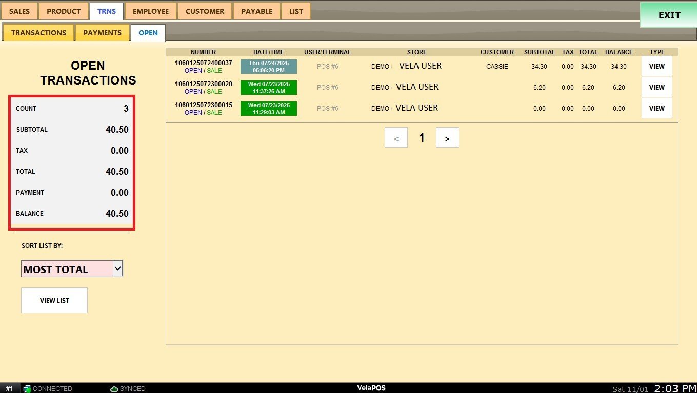 This report provides a detailed view of all transactions that are currently open or pending completion within the system. This helps track unfinished sales and manage customer balances effectively.