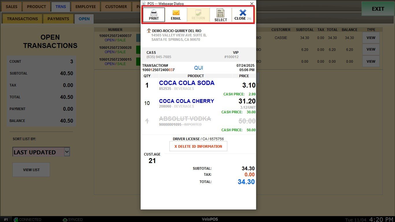 Main Screen>MENU>REPORTS>TRNS>OPEN