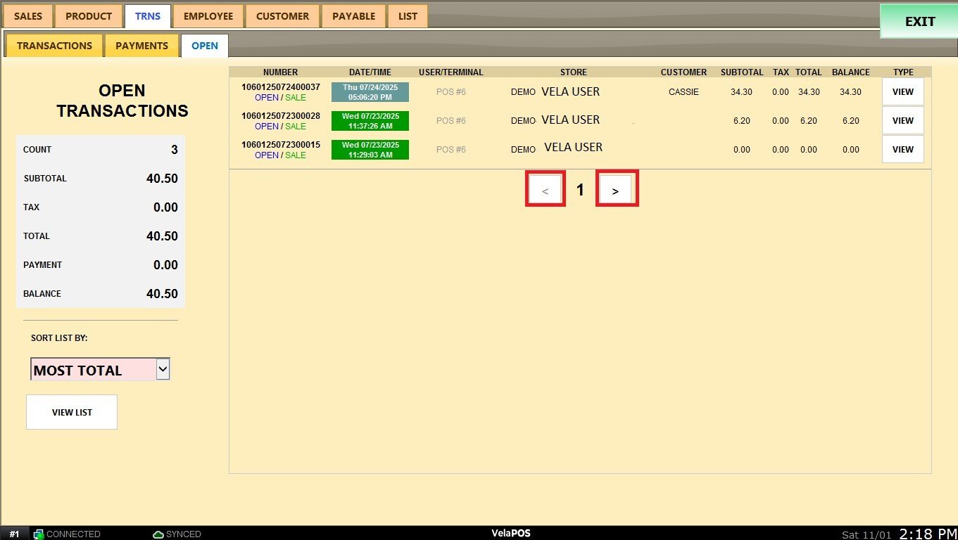 Use the side arrows (< and >) to navigate between pages if multiple transactions are listed.