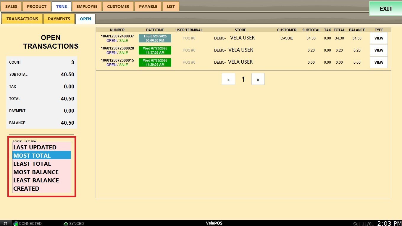MOST TOTAL / LEAST TOTAL: Sorts by total sale amount.