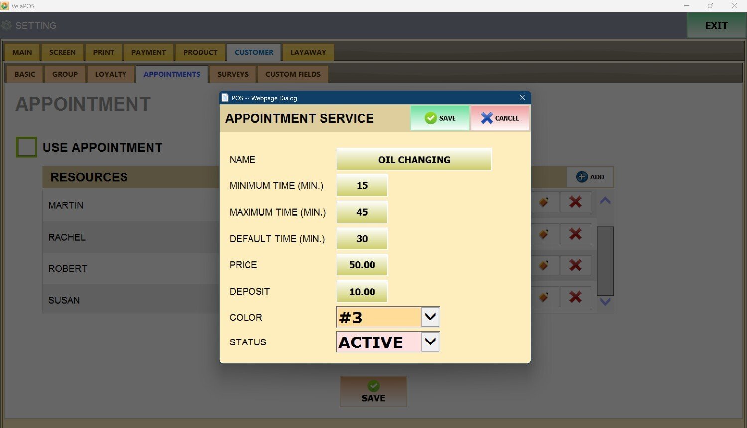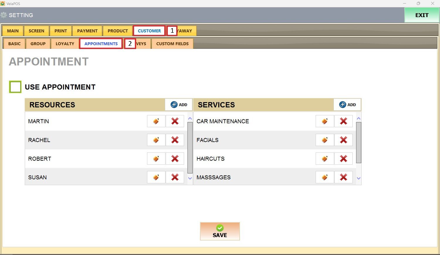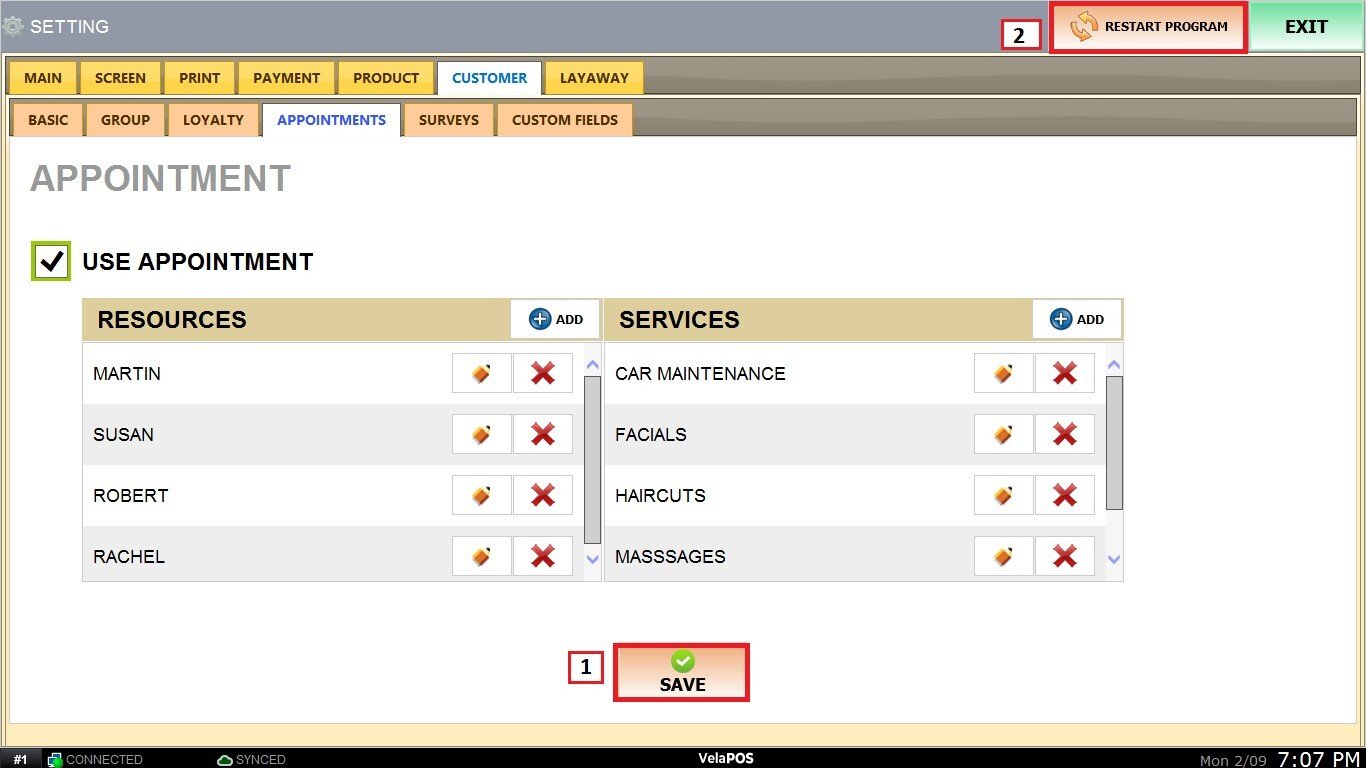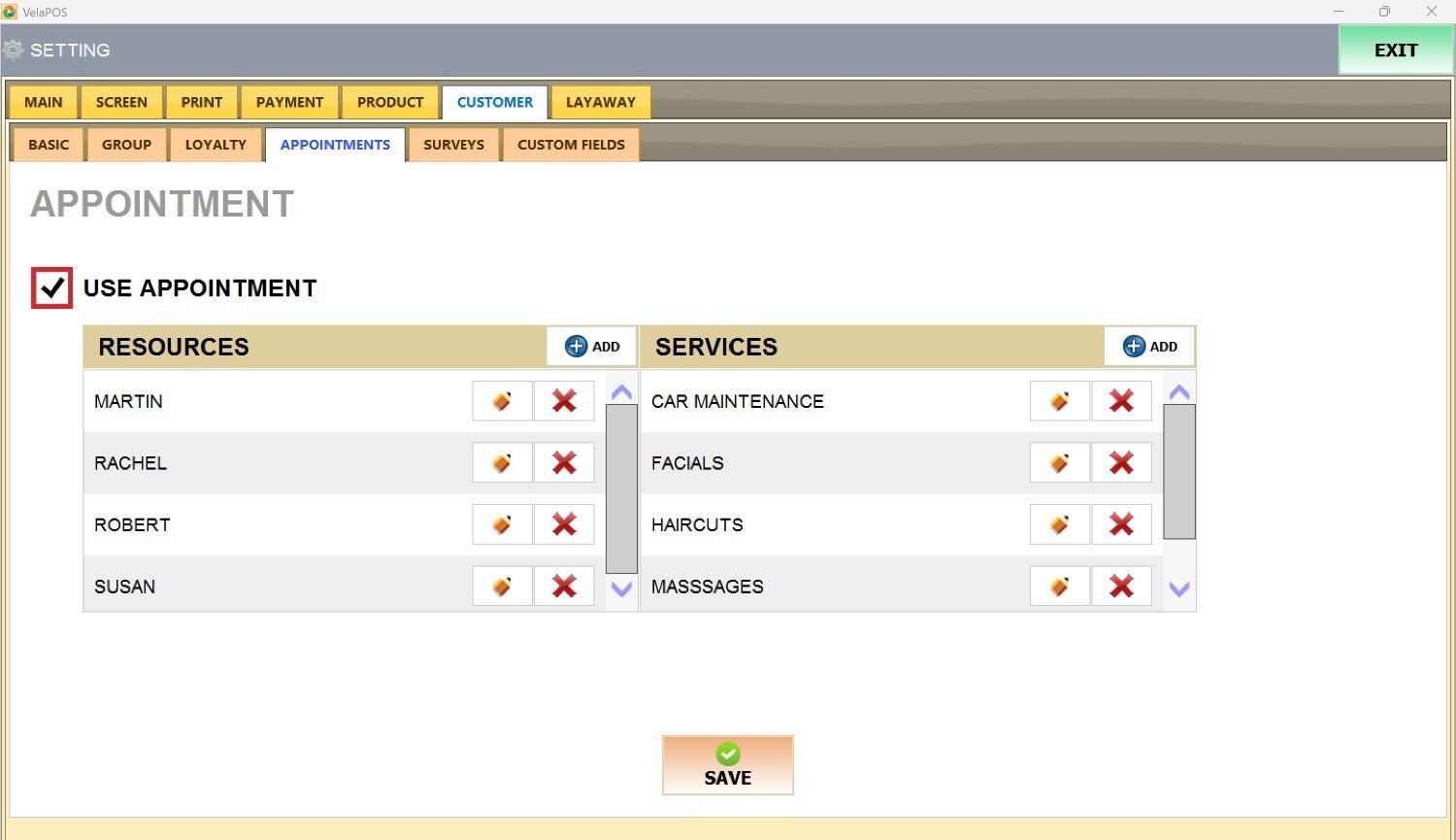 Main Screen> MENU> SETTINGS> CUSTOMER> APPOINTMENTS