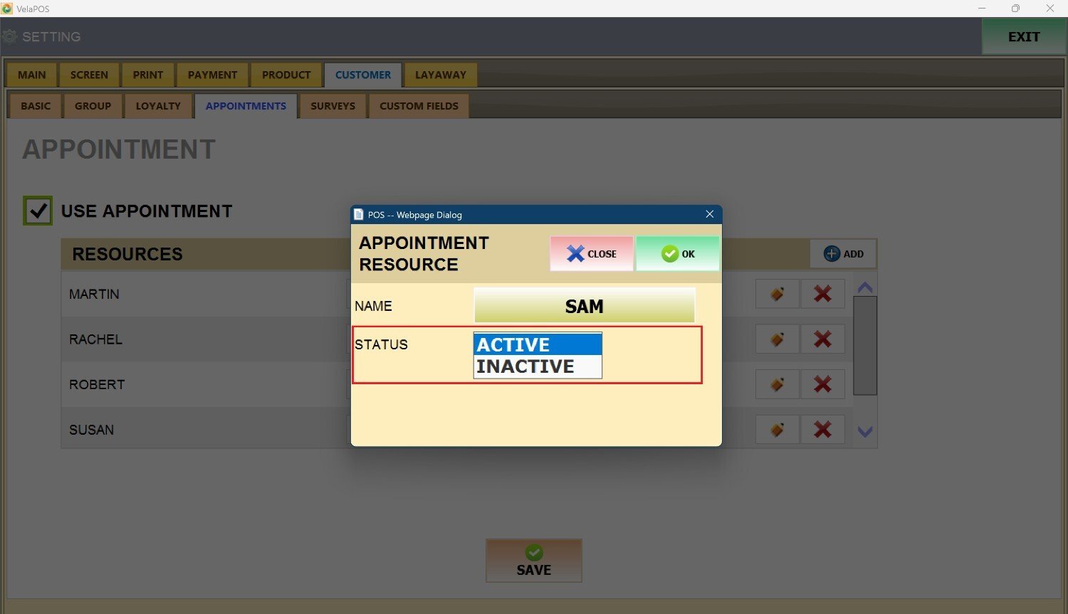 Next to STATUS, open the drop-down menu and select ACTIVE to make the resource available for appointments.