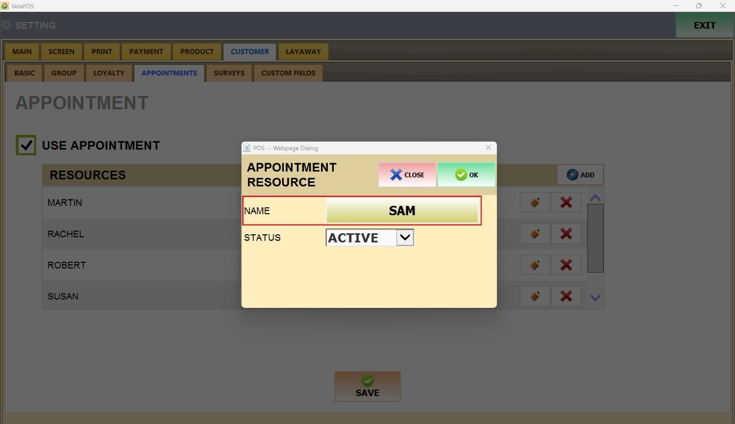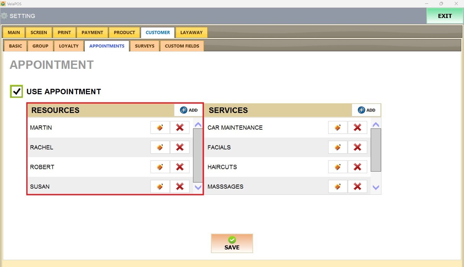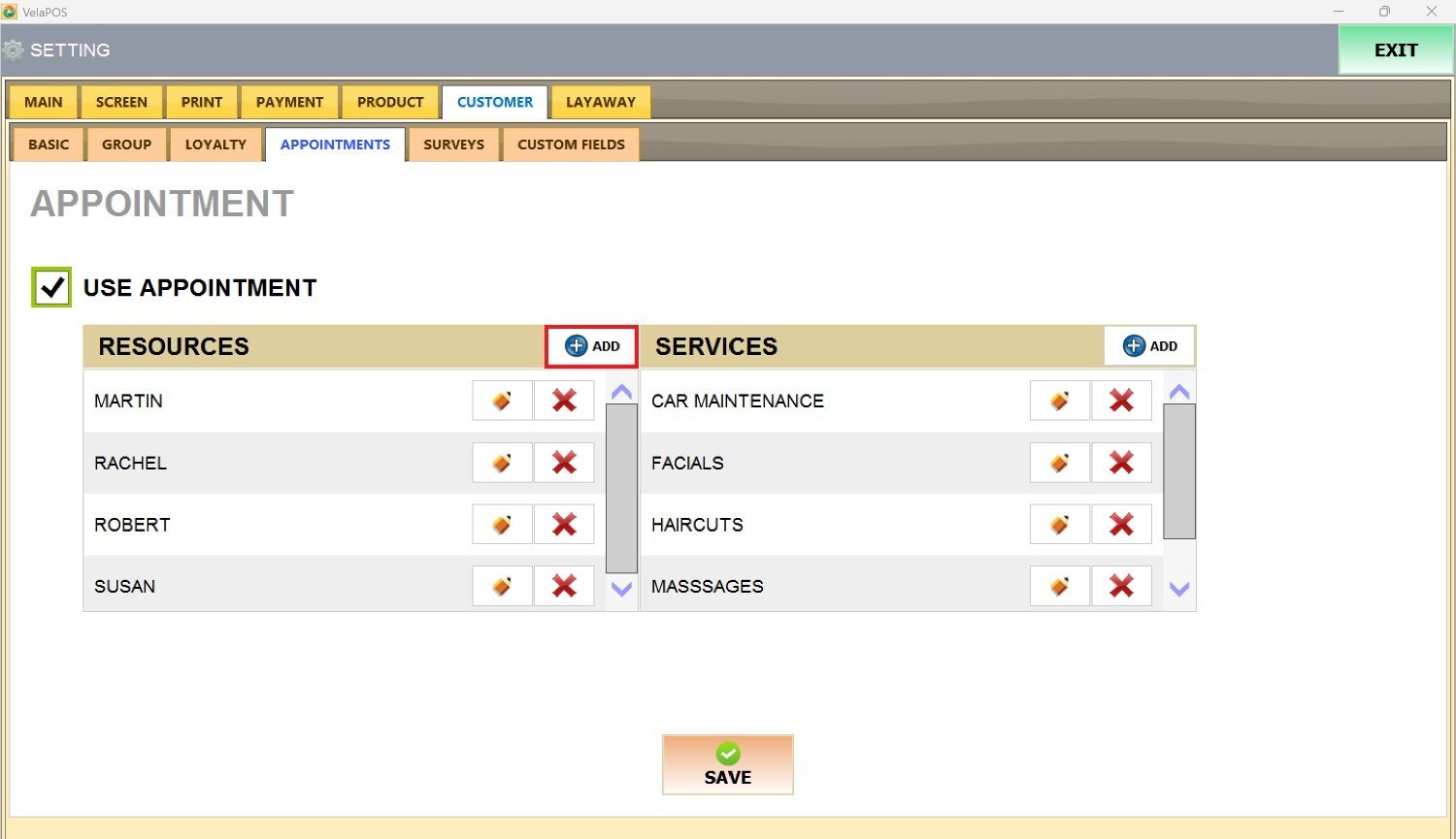 Press the ADD button next to RESOURCES, and it'll open the Appointment Resources screen.