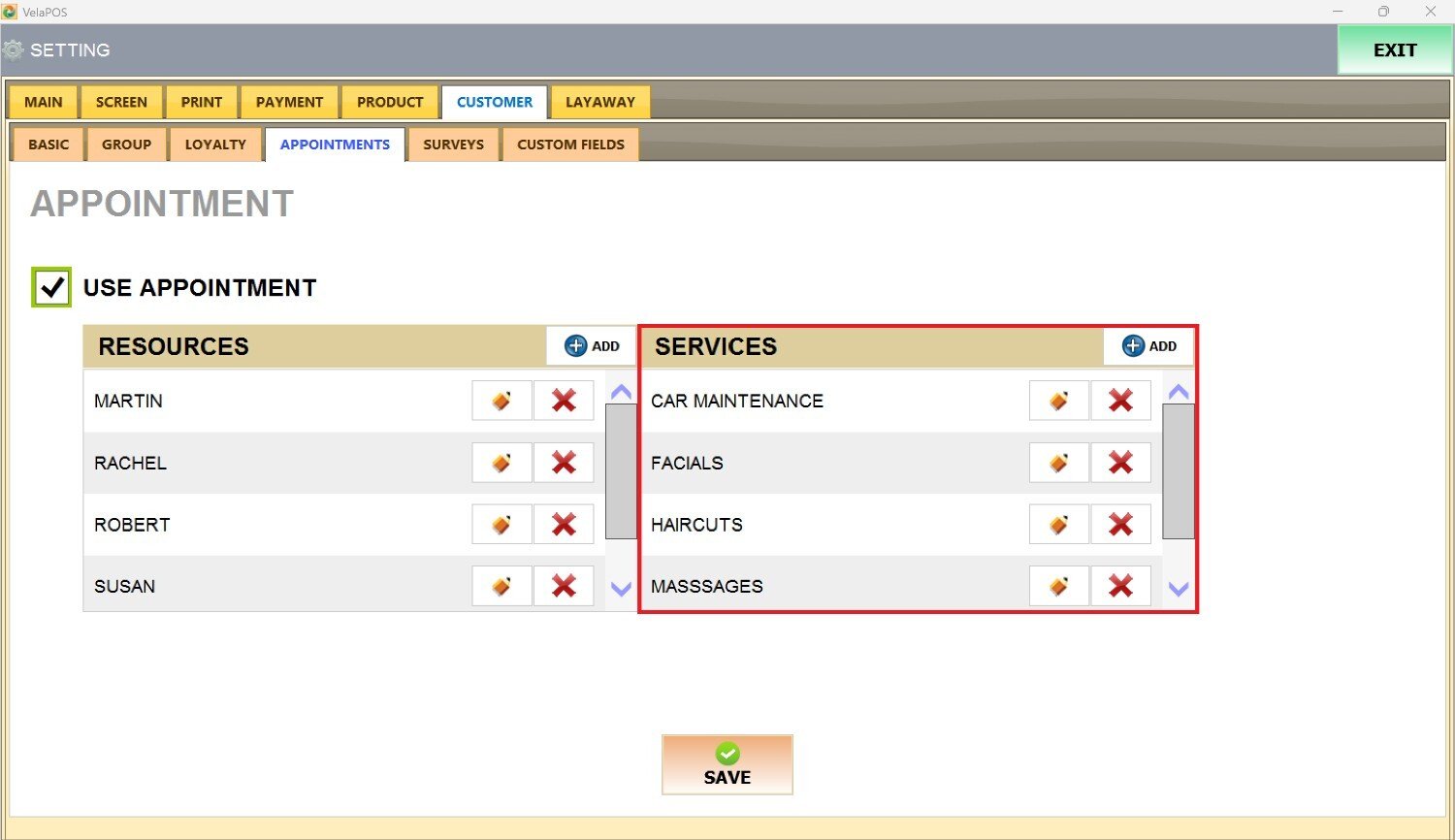 Press the ADD button next to SERVICES, and it'll open the Appointment Service screen.