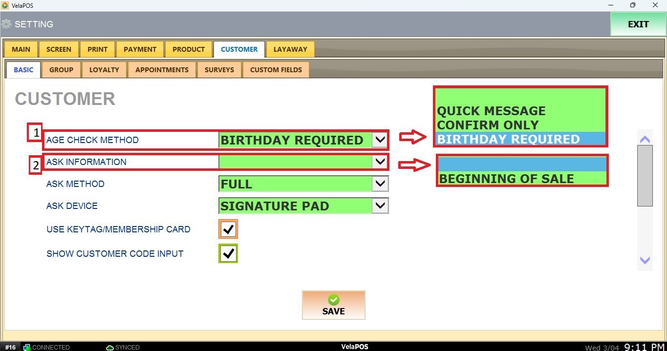This section allows you to configure how the system interacts with customer data during a sale. It controls features such as age verification requirements, the methods used to collect customer information (name, phone number, email), and data validation to help prevent duplicate records.