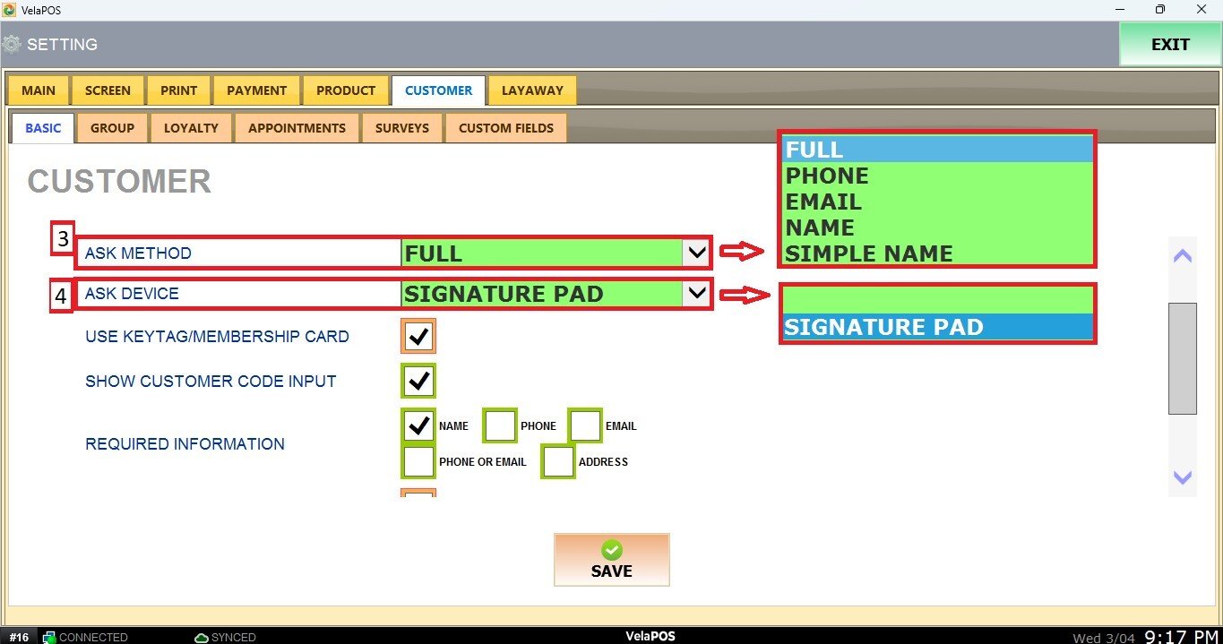 In the dropdown menu, select which device will be used to request customer information. You can choose the Signature Pad, or leave it blank to request the information directly on the POS.