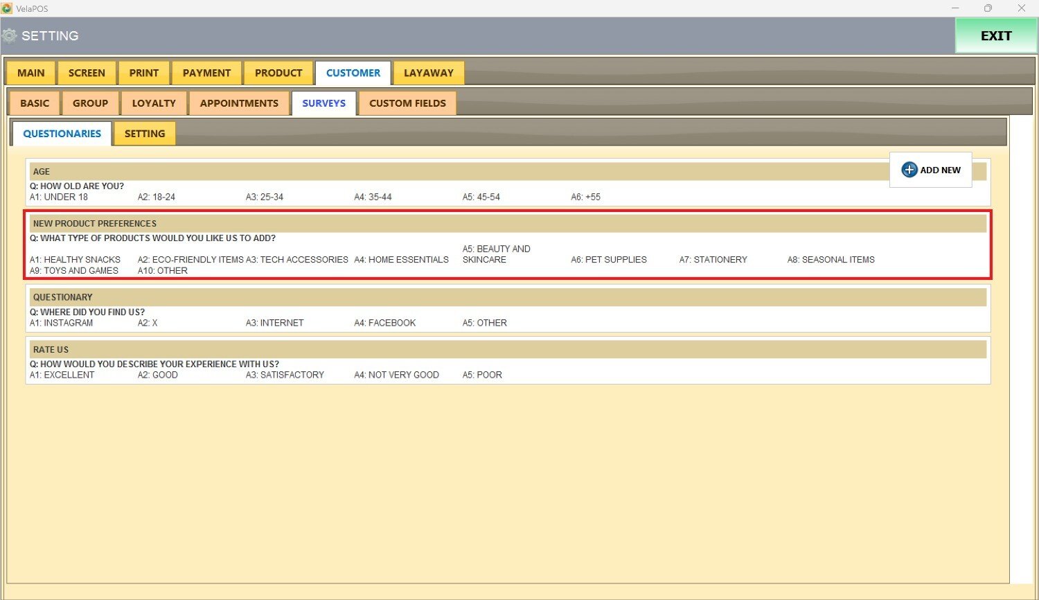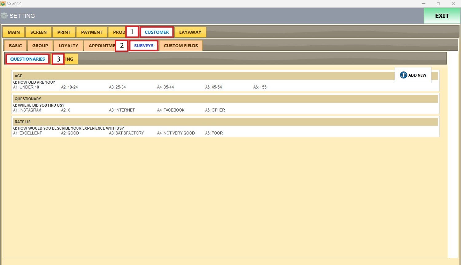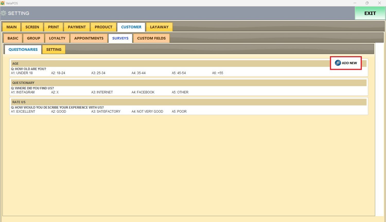 Main Screen> MENU> SETTINGS> CUSTOMER> SURVEYS> QUESTIONARIES