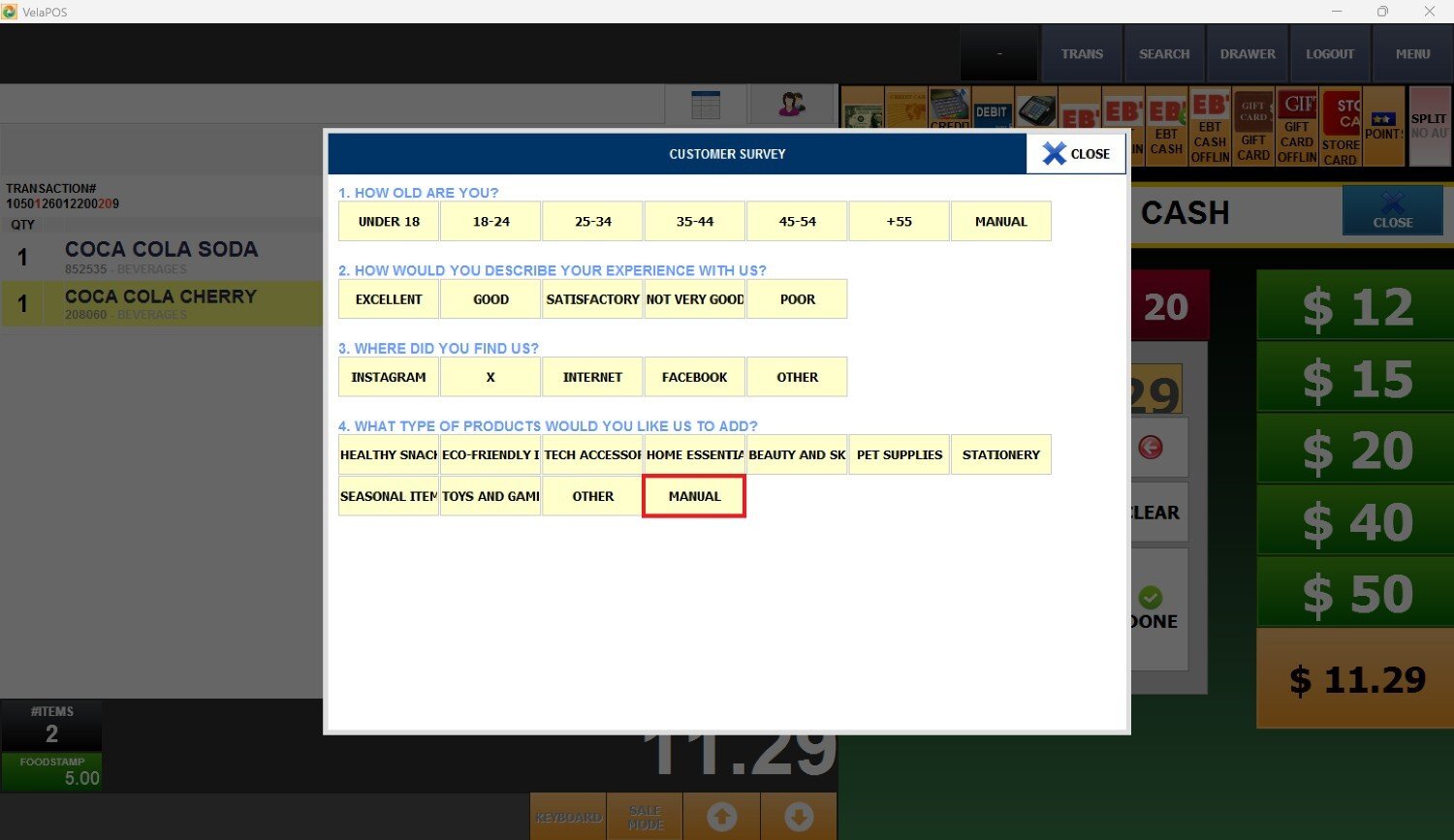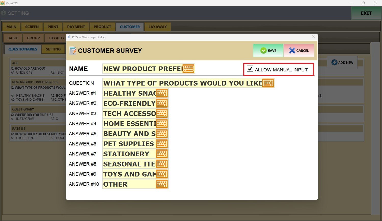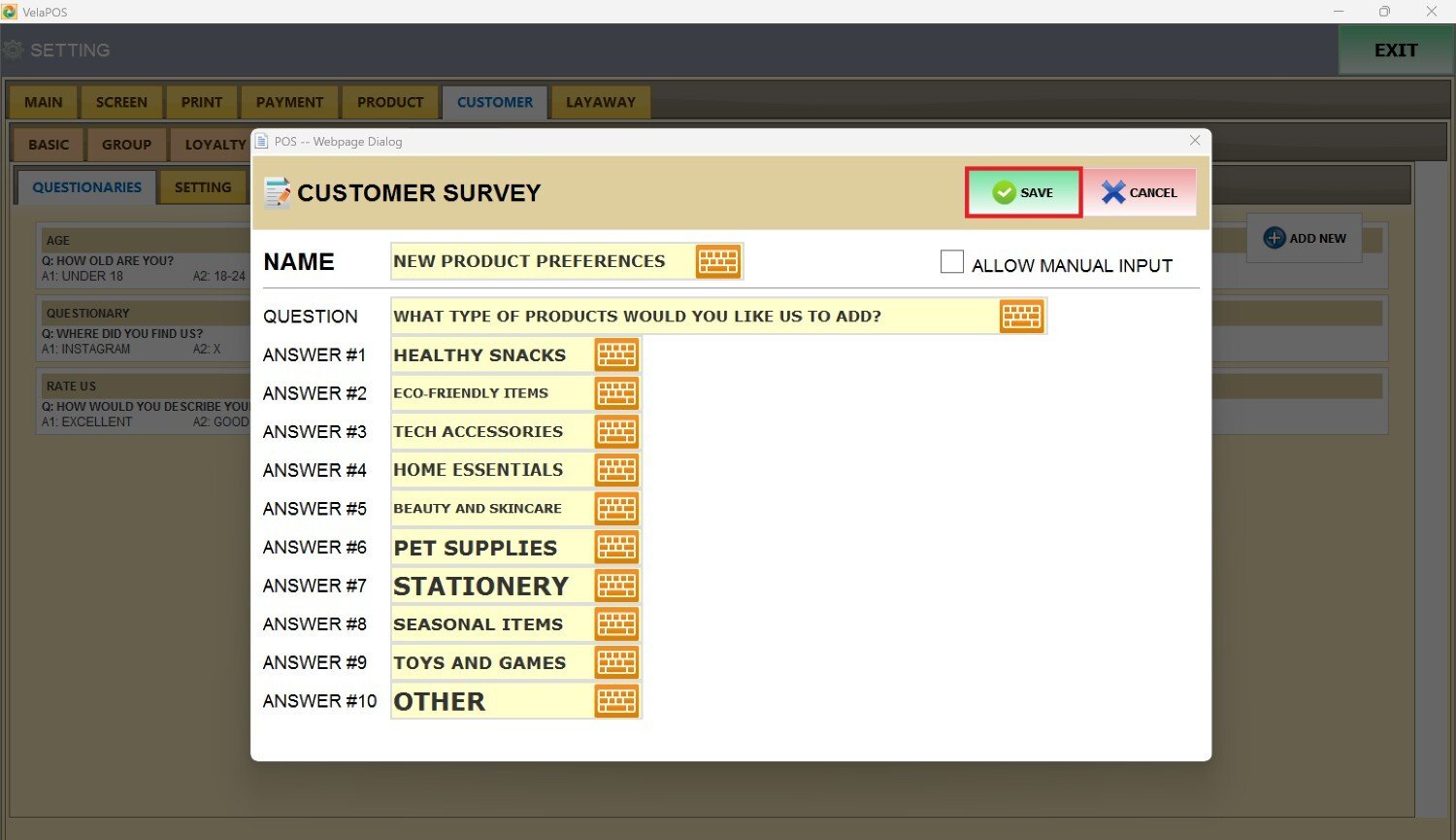 Check the ALLOW MANUAL INPUT box to let the customer enter their own custom response during the survey on that question.