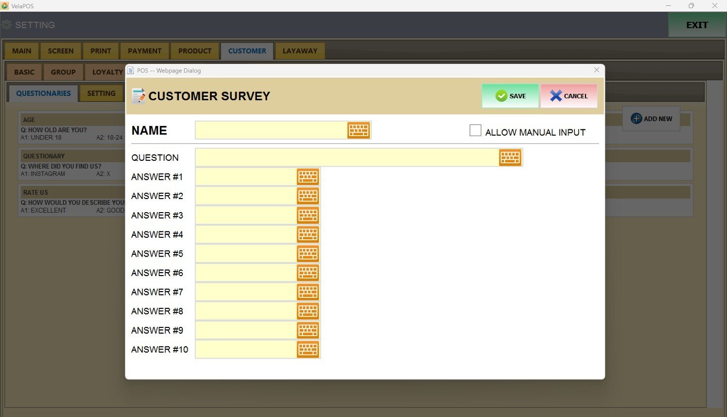 A screen will appear where you can enter the questionnaire details, including its NAME, the main QUESTION, and the ANSWER options available to customers.