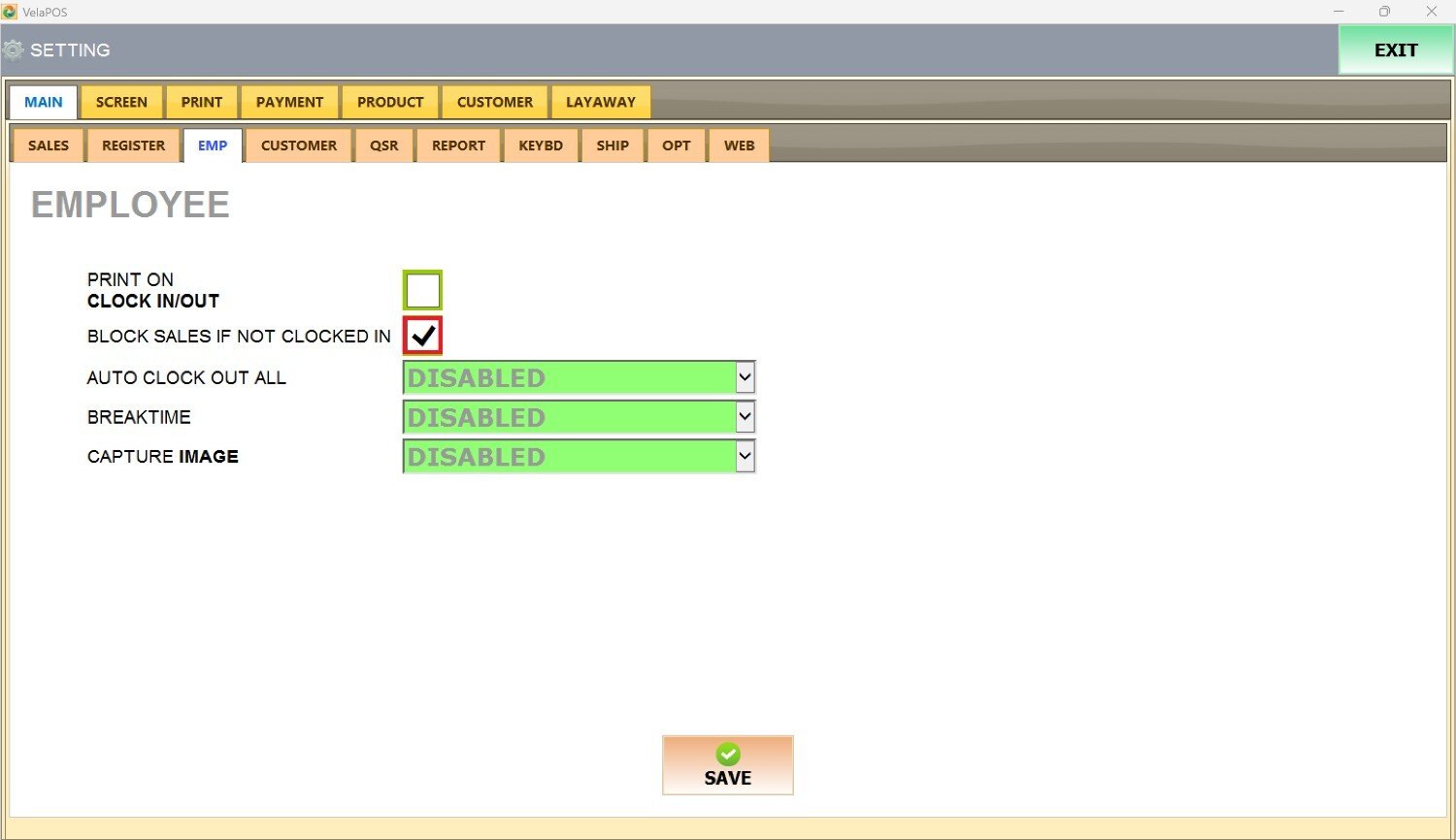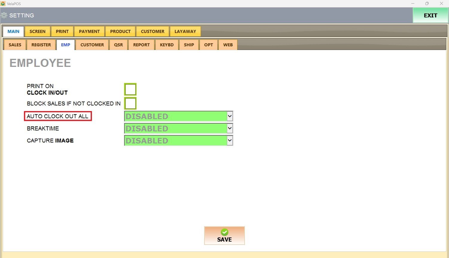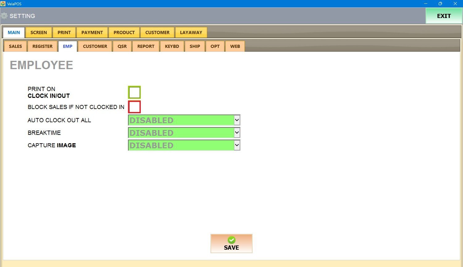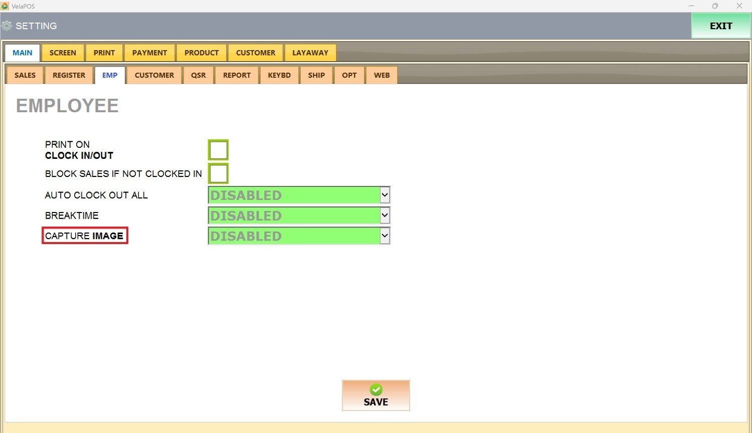 Under MAIN, go to EMP tab to view the available employee configuration options.