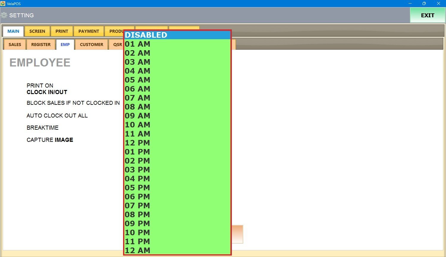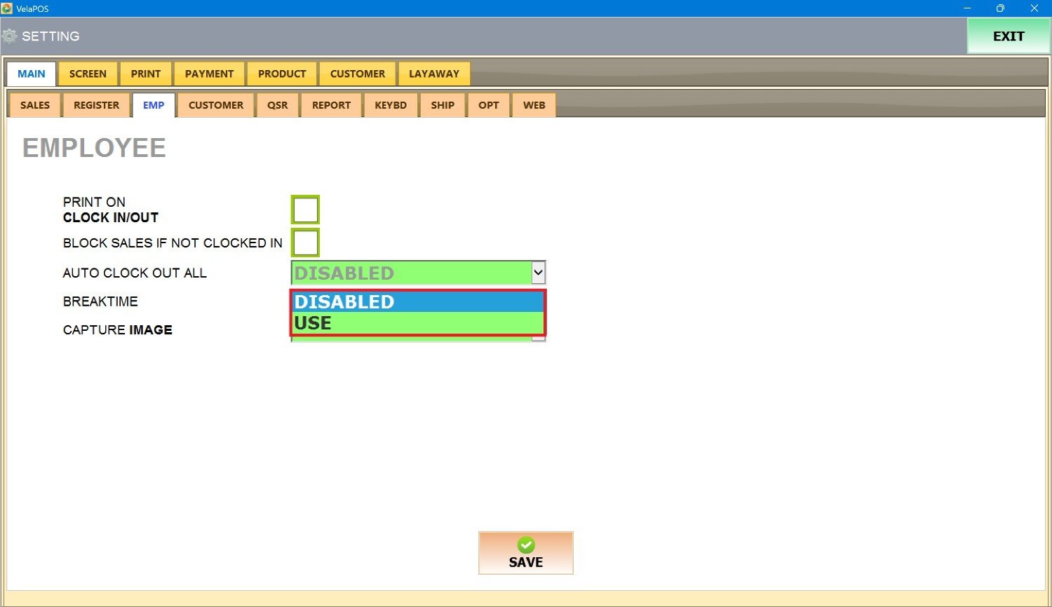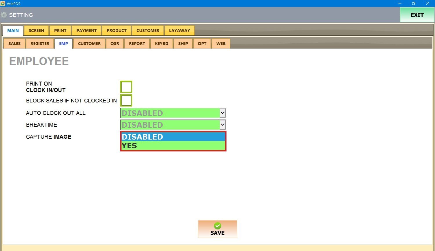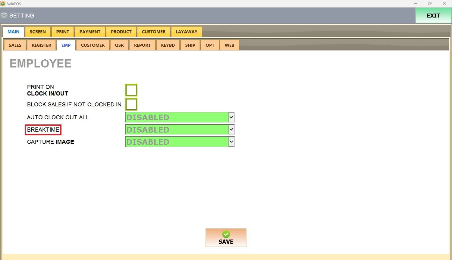 Under MAIN, go to EMP tab to view the available employee configuration options.
