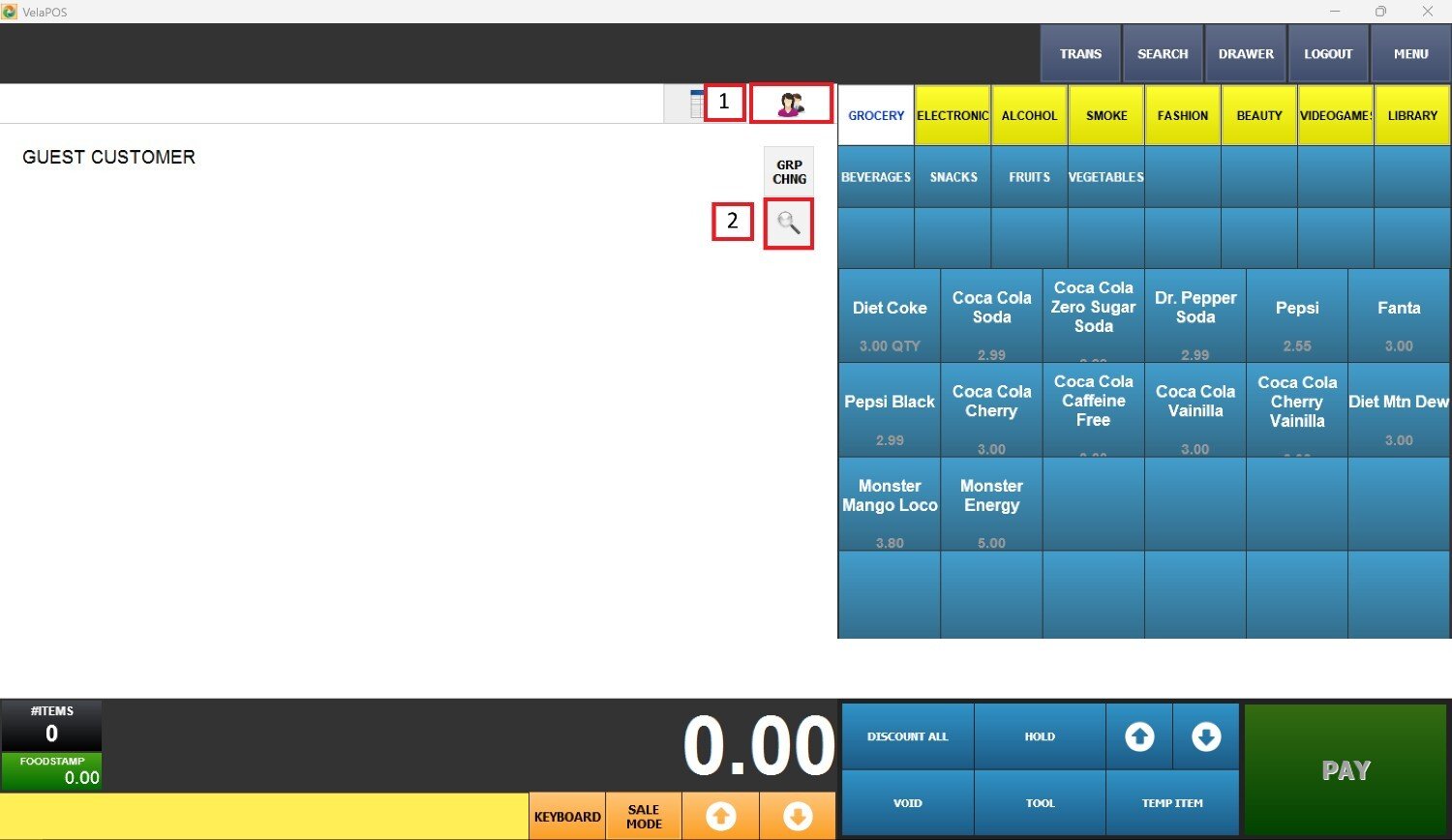 On the Sales Screen, tap the two-people icon to access customer options, then press the magnifying glass to open the full Customer List.