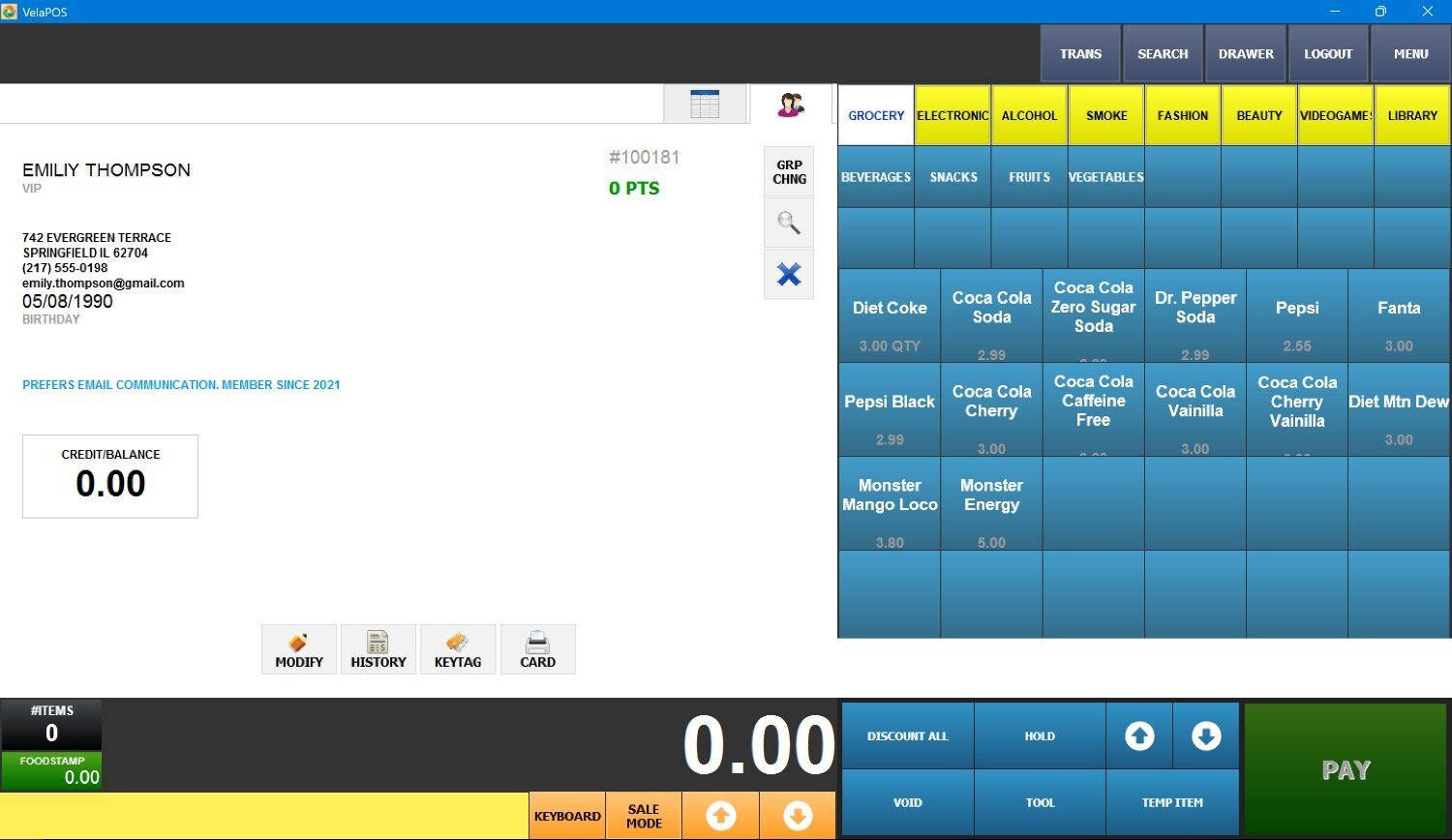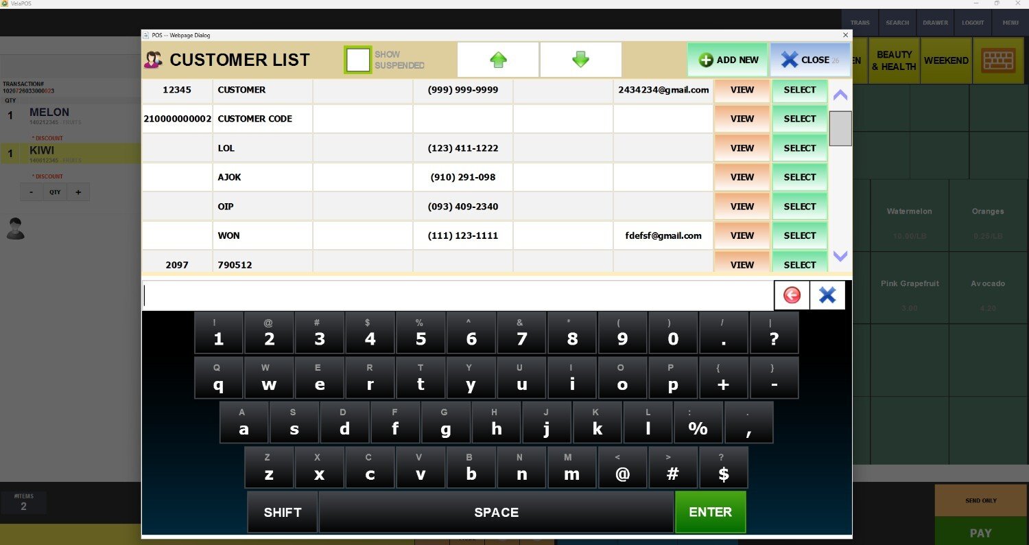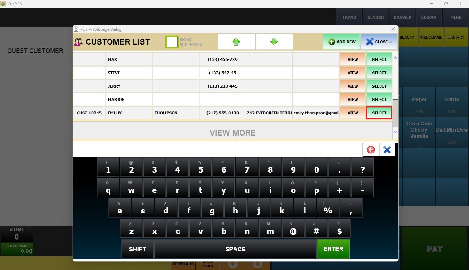 The system prompts the Customer List screen when pressing the PAY button, allowing the selection of a customer account. This step is optional and can be skipped by pressing CLOSE.