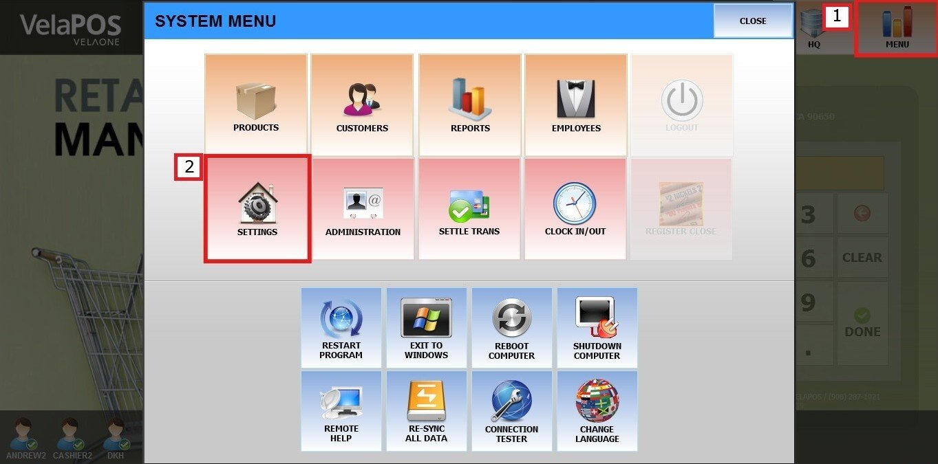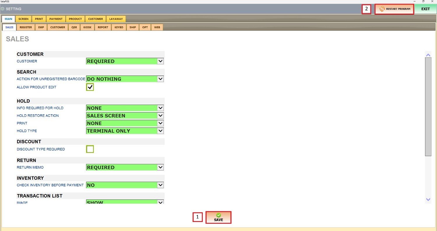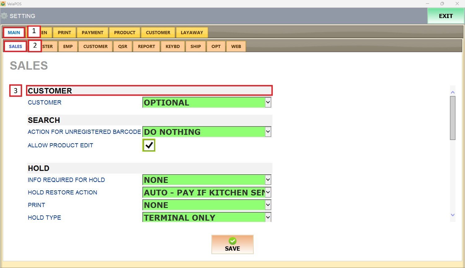 Main Screen> MENU> SETTINGS> MAIN> SALES