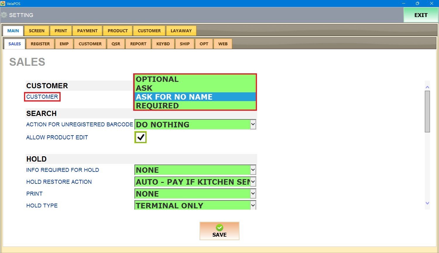 Next to CUSTOMER, use the drop-down menu to define whether and how the cashier must interact with customer information during a transaction.