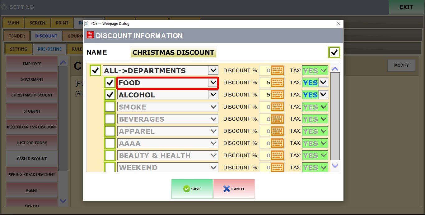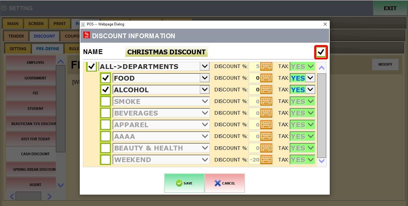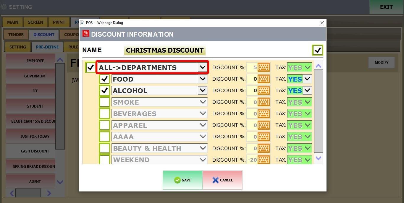 Left Side Checkboxes: Turn the discount on or off for specific departments or categories