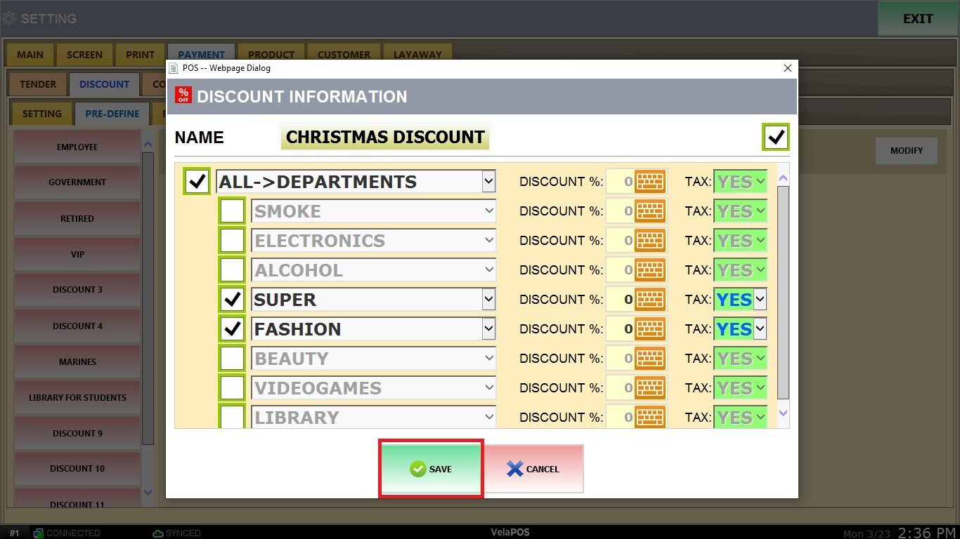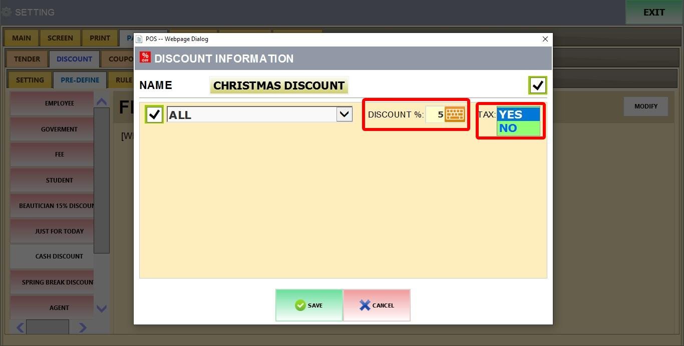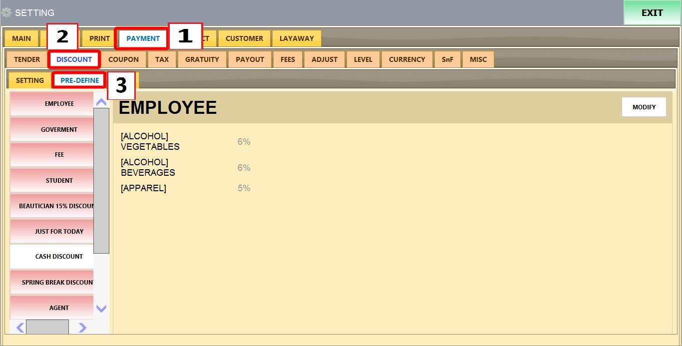 Click PAYMENT, then DISCOUNT, and select the PRE-DEFINE tab