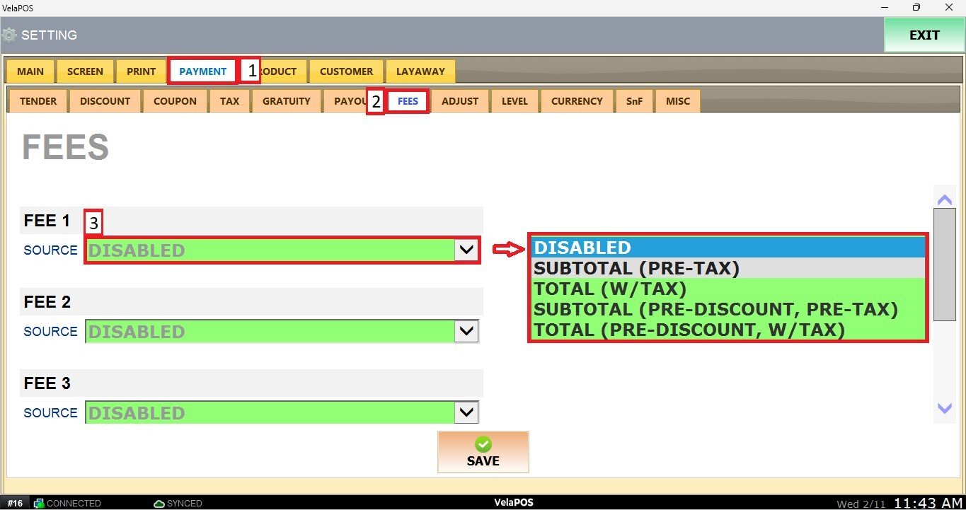 Main Screen> MENU> SETTINGS> PAYMENT> FEE