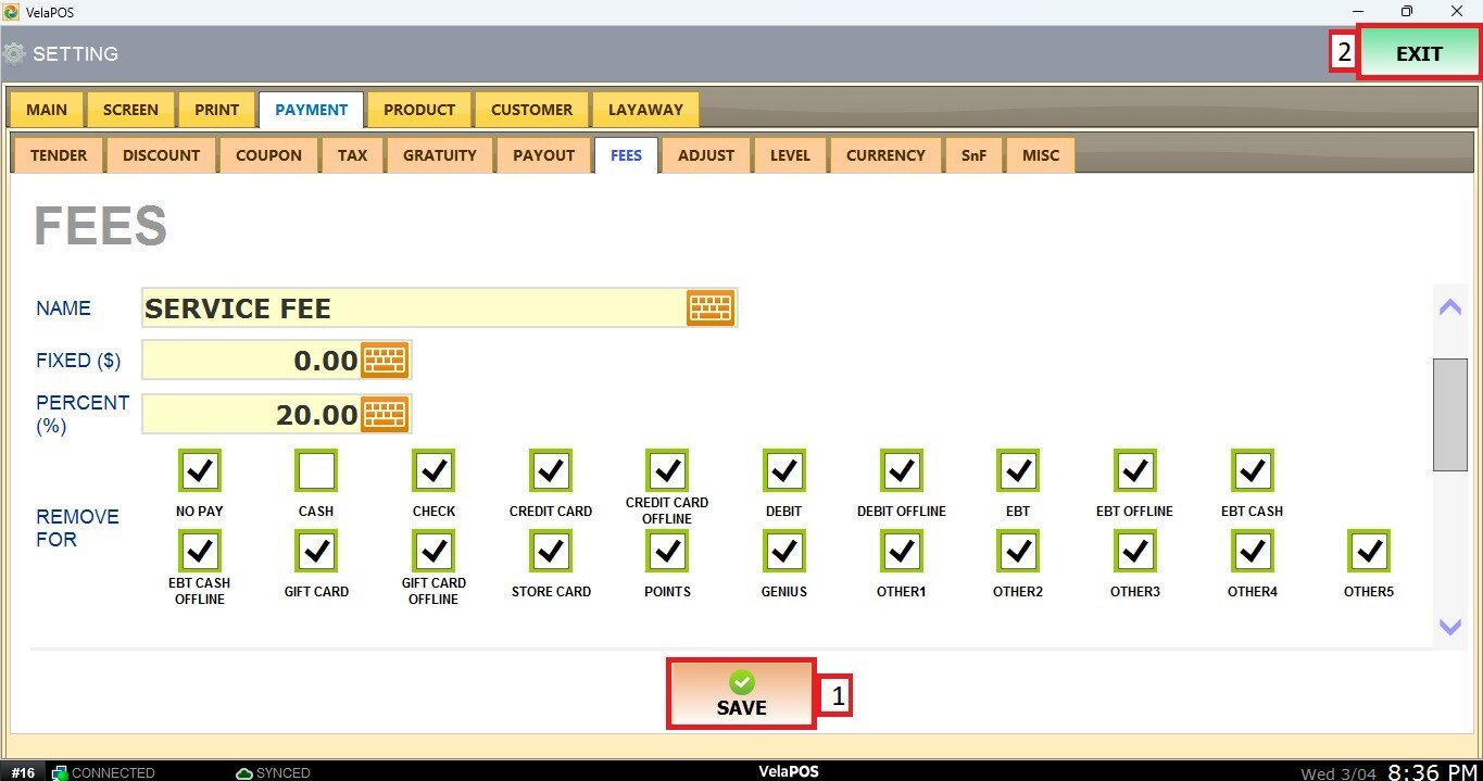 REMOVE FOR: Check the box for the payment types where the fee should NOT be applied.